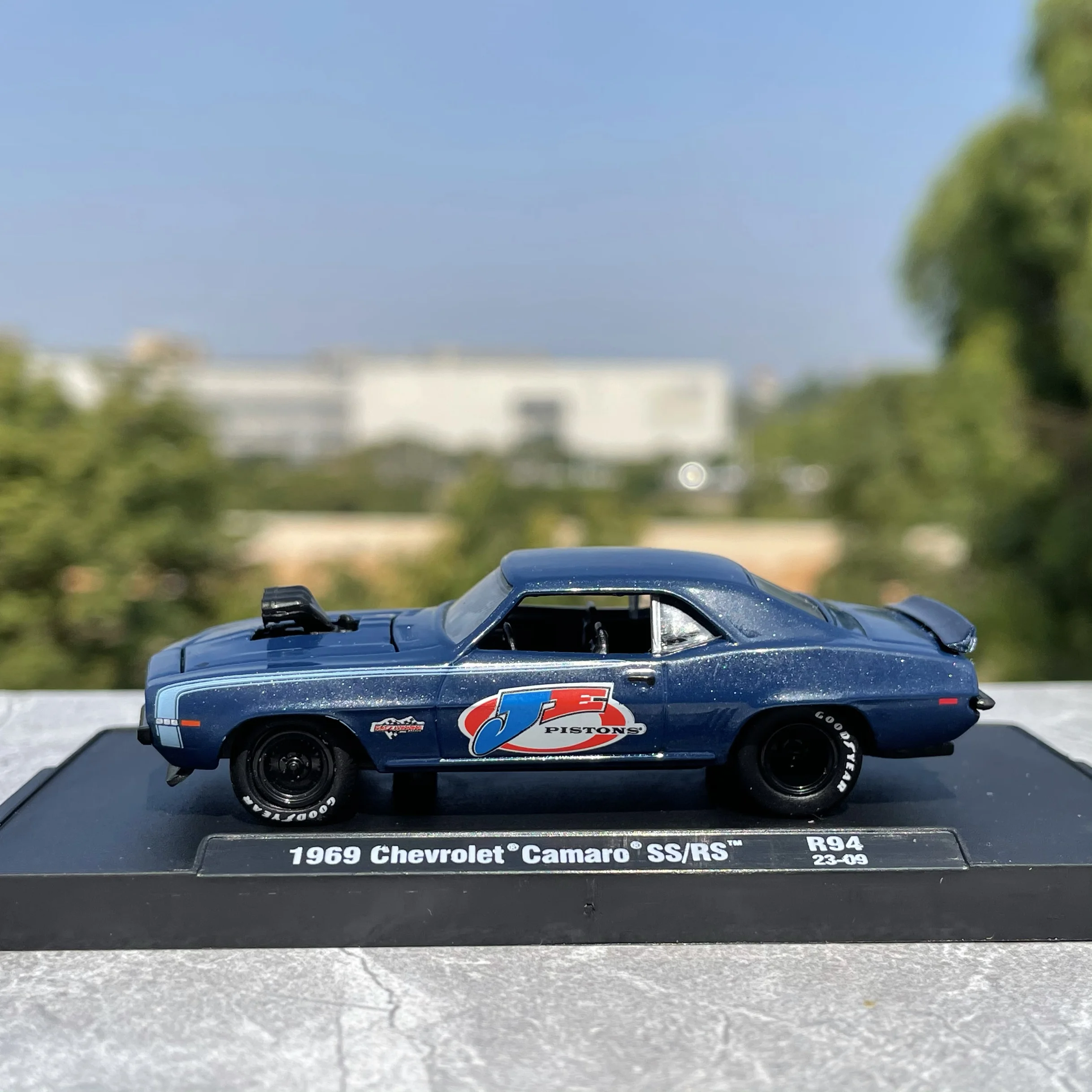 Experience the timeless appeal of the 1969 Chevrolet Camaro SS/RS with this detailed 1:64 scale diecast model. Crafted from metal for a realistic, glossy alloy-like finish, this collectible features a vibrant metallic blue body accented by lighter blue racing stripes, a black hood scoop, and a black grille. The model’s sleek muscle car silhouette includes a long hood, short rear deck, tail lights, integrated spoiler, and clear windshield revealing a black interior. Black wheels with white-lettered tires and realistic tread provide added authenticity. Perfect for display or collection, this high-quality replica offers a vintage-inspired sporty aesthetic that captures the iconic Chevrolet Camaro’s character.