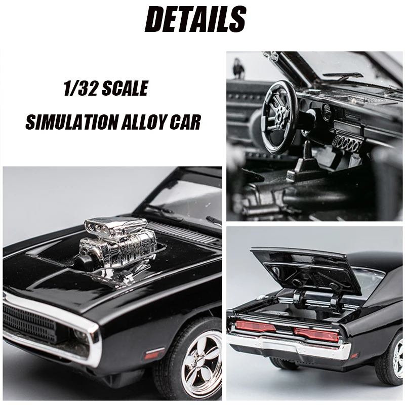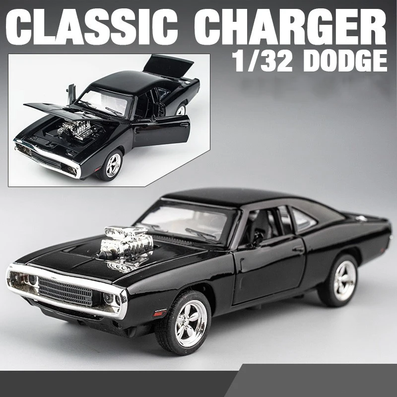 Step into the world of vintage muscle cars with this stunning 1:32 scale diecast model of the 1970 Dodge Challenger. Crafted with meticulous detail, this model features a sleek, glossy black finish that showcases its iconic curves and powerful stance. The front boasts a wide grille with dual circular headlights, while the elaborate chrome-bladed supercharger protrudes from the hood, adding a touch of aggressive performance. Functional opening doors allow you to explore the intricately designed interior, and the pull-back mechanism provides dynamic play. Enhanced with sound and light functions, this model captures attention and adds realism. Built from durable alloy and plastic, it’s perfect for collectors and enthusiasts who appreciate high-quality craftsmanship and timeless automotive style.