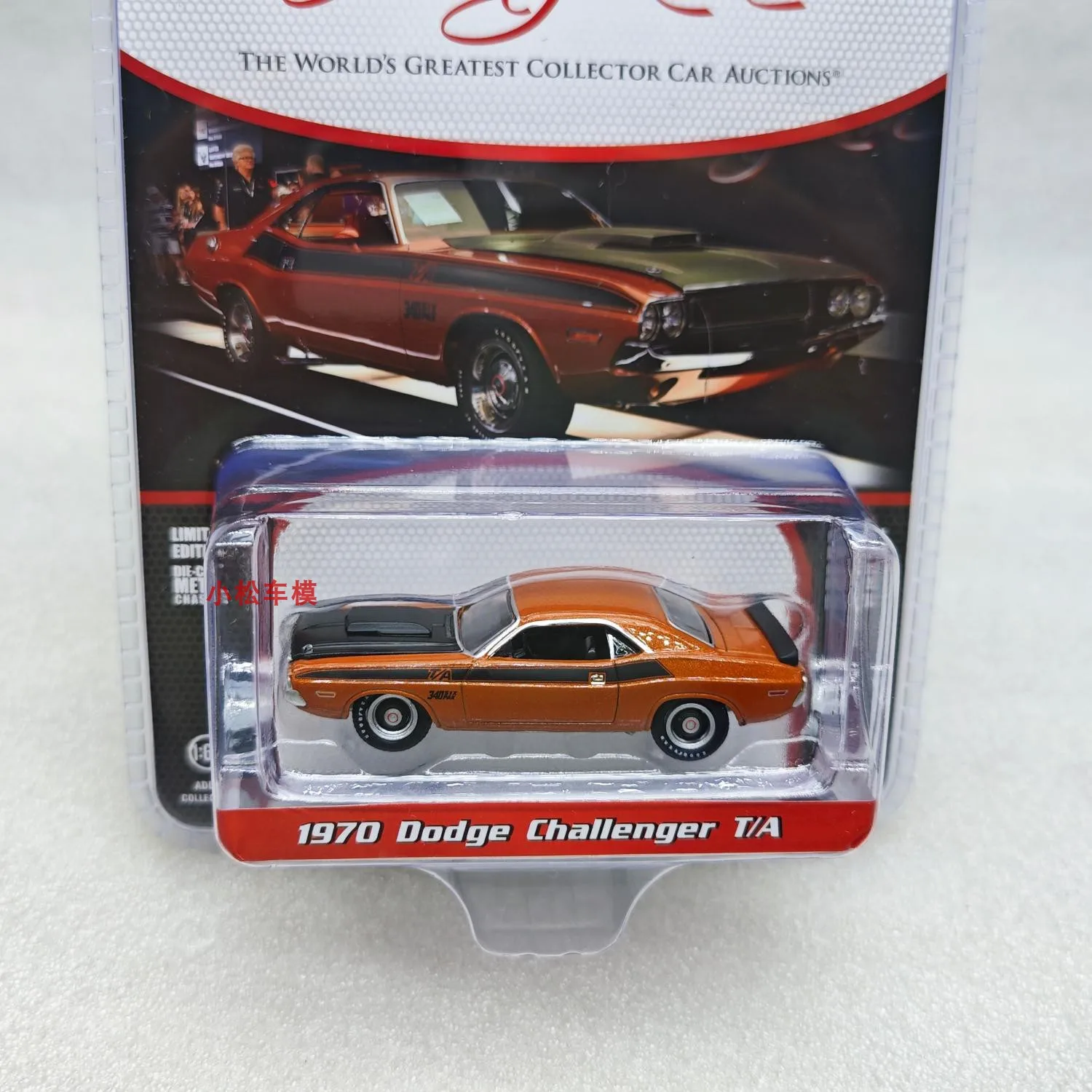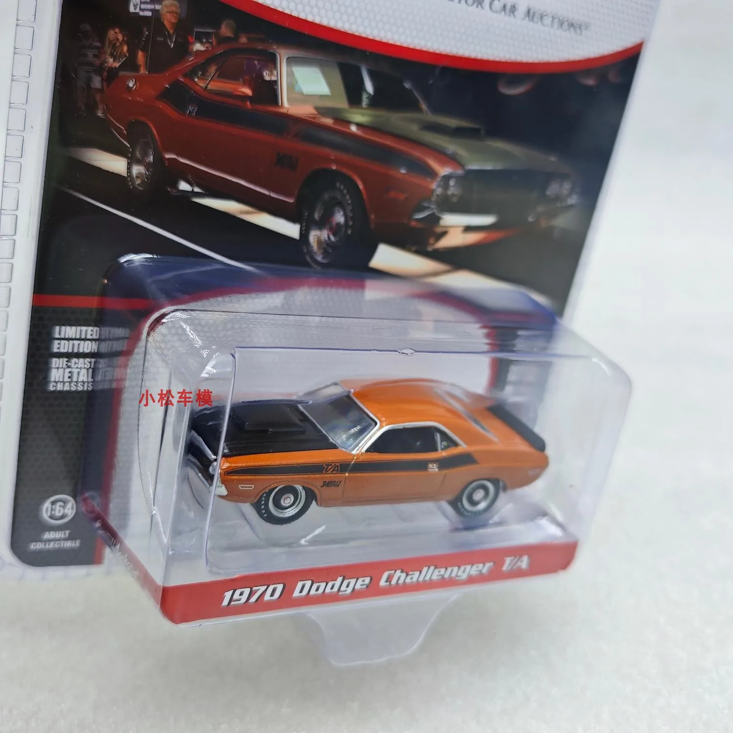 Imagine adding this eye-catching 1:64 scale diecast model of the iconic 1970 Dodge Challenger T/A in Burning Orange to your collection. Exhibiting a sleek and aerodynamic silhouette, this meticulously crafted replica features a glossy orange finish that captures the vibrant essence of the original muscle car. The black racing stripes along the sides enhance its aggressive and sporty character, while the prominent black hood scoop adds dynamic detail. With its sharply angled rear window and low, sloped roofline, this model embodies authentic vintage muscle car styling. The front and rear taillights, along with finely detailed rims and treaded tires, complete the realism. Perfect for display, it offers a striking blend of vivid color and metallic polish, making it a prized collector’s item.