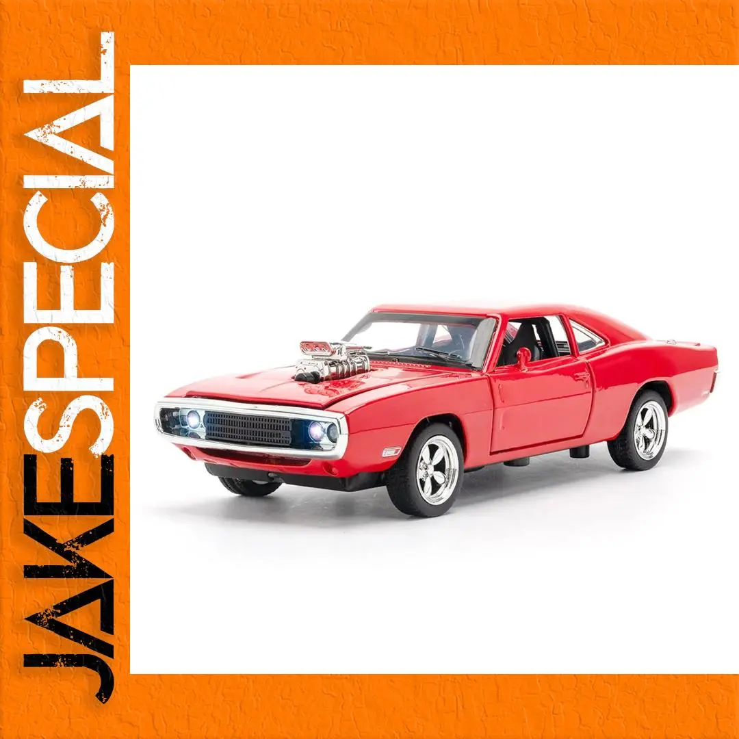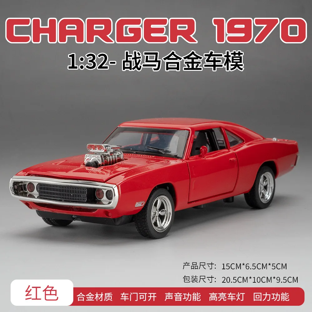 Step into the world of classic American muscle cars with this meticulously crafted 1:32 scale diecast model of the 1970 Dodge Charger. Finished in a stunning glossy red, this replica boasts aerodynamic contours and a sleek, elongated body that exudes power and style. The front grille, with its horizontal slats, is complemented by bright bluish-white LED-illuminated round headlights, adding a modern showcase touch. The detailed engine supercharger with air intake scoops on the hood hints at high performance and racing spirit. Its side profile features tinted black windows, matching red side mirrors, and vintage five-spoke silver wheels that enhance its authentic appearance. Whether for display or collection, this model offers a dynamic, eye-catching tribute to classic muscle cars.