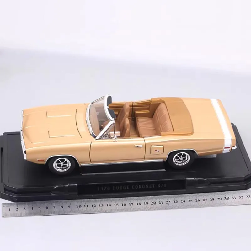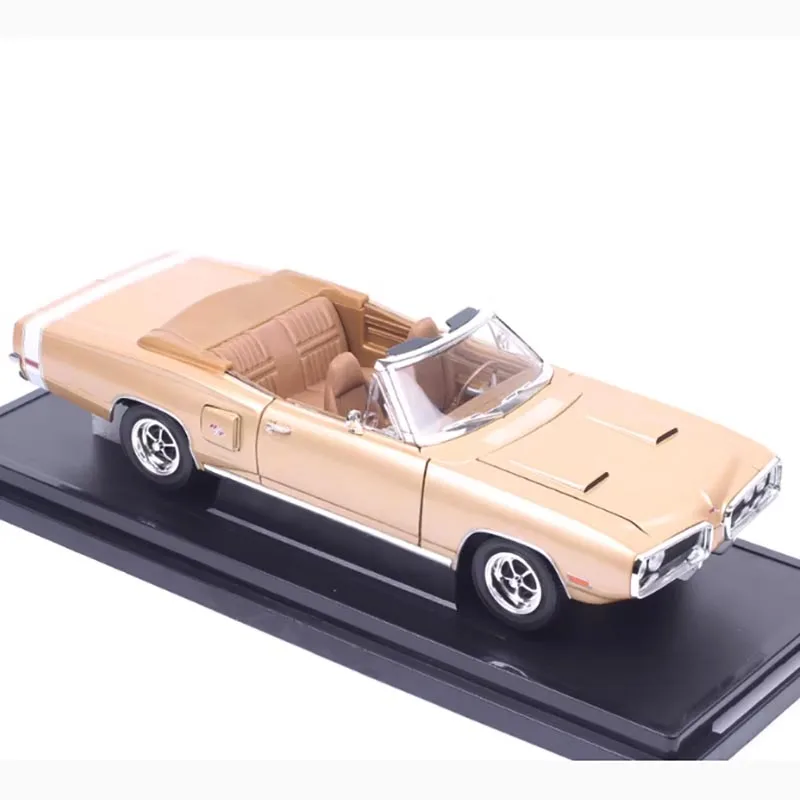 Step into the world of classic muscle cars with this beautifully crafted 1/18 scale diecast replica of the 1970 Dodge Coronet R/T convertible. Designed for enthusiasts and collectors alike, this model captures the vintage charm and powerful presence of the original vehicle. Its metallic beige or champagne finish radiates elegance, complemented by detailed sculpted lines, contours, and authentic features such as a sculpted hood and intricate front grille. The open roof reveals a subtle glimpse of the interior, while the multi-spoke wheels with chrome rims and realistic tread tires enhance its realism. Display it proudly in your collection or gift it to a fellow automotive lover for a timeless keepsake of automotive history.
