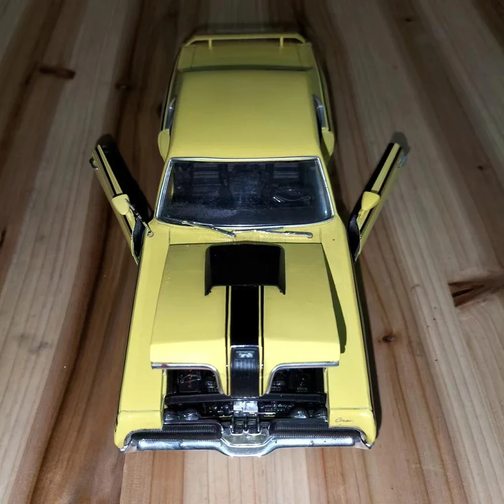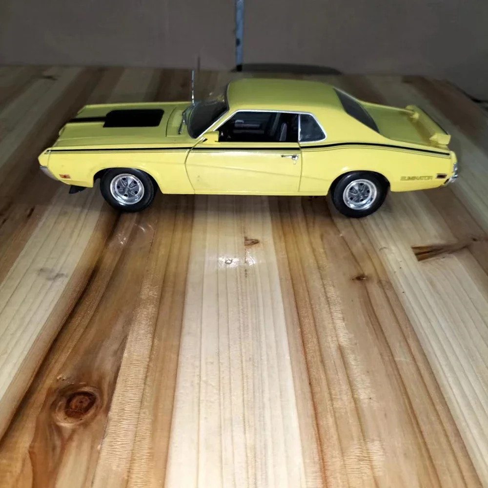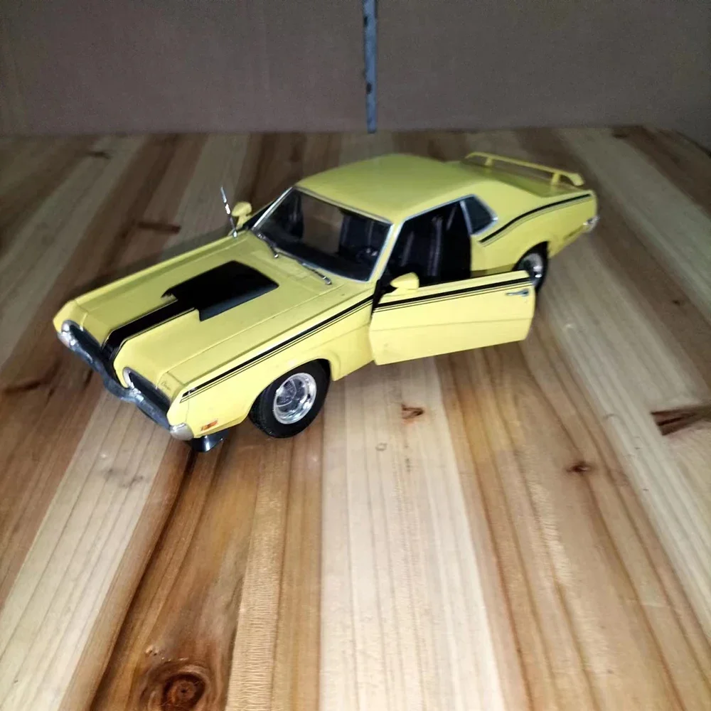 A detailed 1:18 scale die-cast model of the 1970 Mercury Cougar Eliminator, measuring approximately 27.5 x 10 x 7 cm. Crafted from alloy, plastic, and rubber, it features functioning rotating wheels, and openable doors, hood, and trunk, capturing the classic muscle car’s sleek and aggressive design. The vibrant yellow finish with distinctive black racing stripes adds to its vintage appeal, complemented by chrome accents and realistic details like the grille, headlights, and black interior. Please note surface paint imperfections and minor rashes, emphasizing its collectible and decorative purpose. Perfect for enthusiasts seeking a striking display piece or a nostalgic gift.