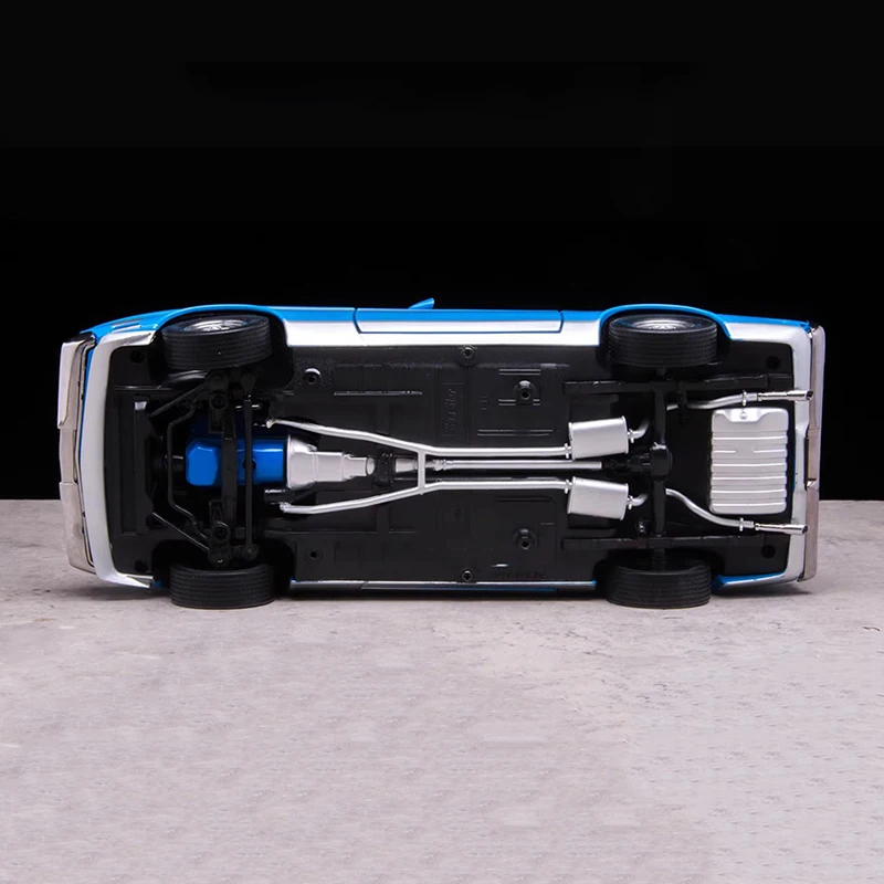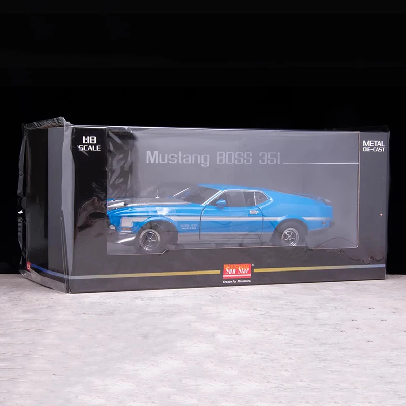 Experience the iconic 1971 Ford Mustang Boss 351 with this detailed 1:18 scale alloy model by Sun Star. Measuring approximately 27 cm long, 10 cm wide, and 8 cm high, this collectible features a vivid blue exterior with a distinctive white side stripe, contrasting with sleek black grille and rectangular headlights. The model boasts realistic five-spoke silver alloy wheels with rubber tires, functional doors that open, and front wheel steering linked to a steering wheel. Crafted from a metal body with a plastic chassis and internal structure, it offers a premium display piece for enthusiasts aged 14 and above, capturing the muscle car’s bold, sporty aesthetic with precision and elegance.
