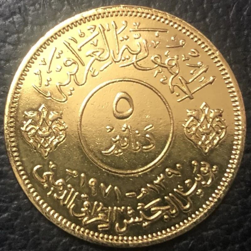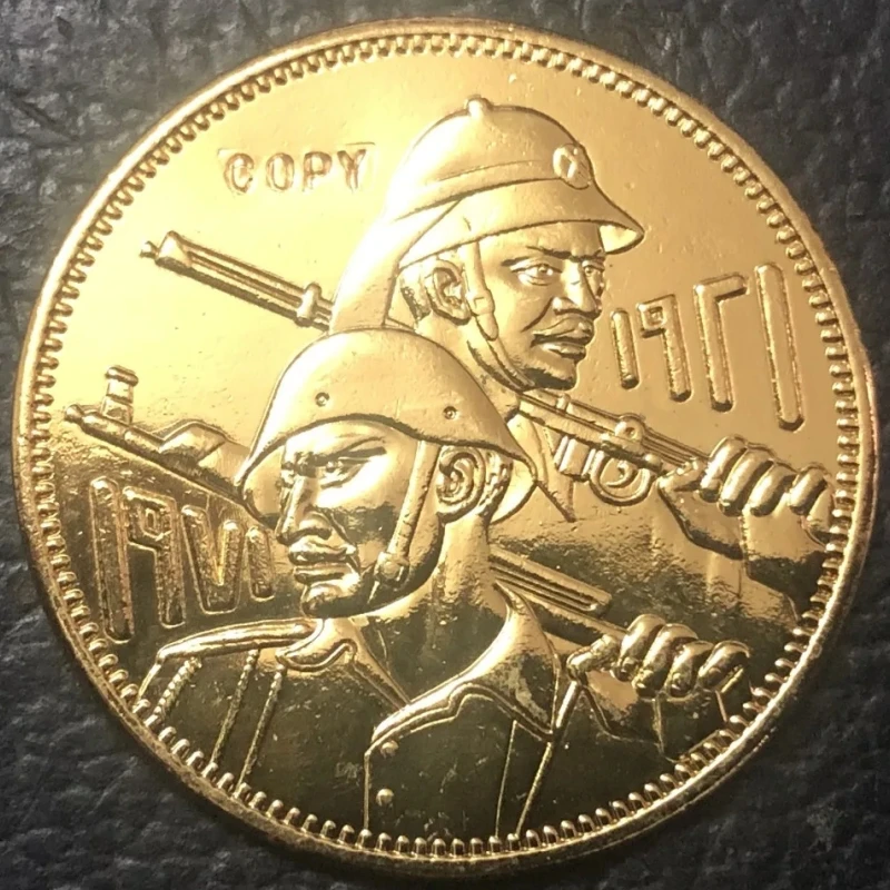 This replica coin models the 1971 Iraqi 5 Dinars Iraqi Army gold copy, cast in metal with a polished, antique finish that exudes a vintage look. Featuring detailed reliefs of two soldiers in military attire, one with a serious expression and the other holding a rifle across his shoulder, the coin showcases fine craftsmanship and intricate linework. The smooth background contrasts with a finely beaded border, enhancing its classic appeal. Inscribed with Arabic script and Latin lettering, it celebrates military history and heritage. Manufactured using casting techniques to replicate the design from 1960 to 1979, this collectible coin offers a realistic, historical aesthetic for enthusiasts and collectors alike.