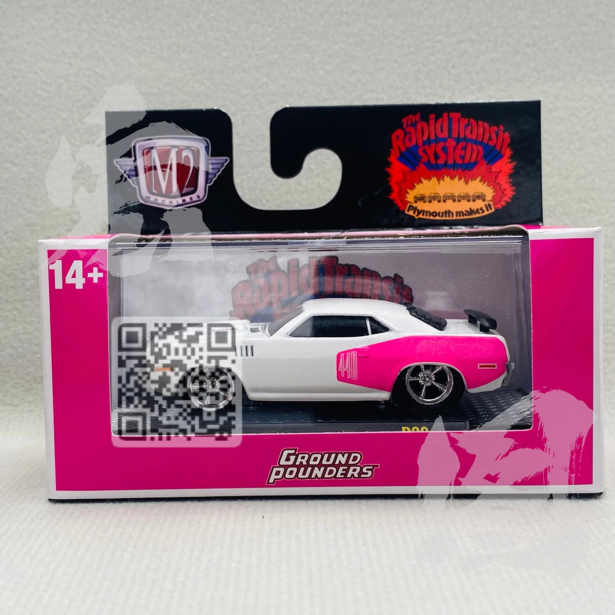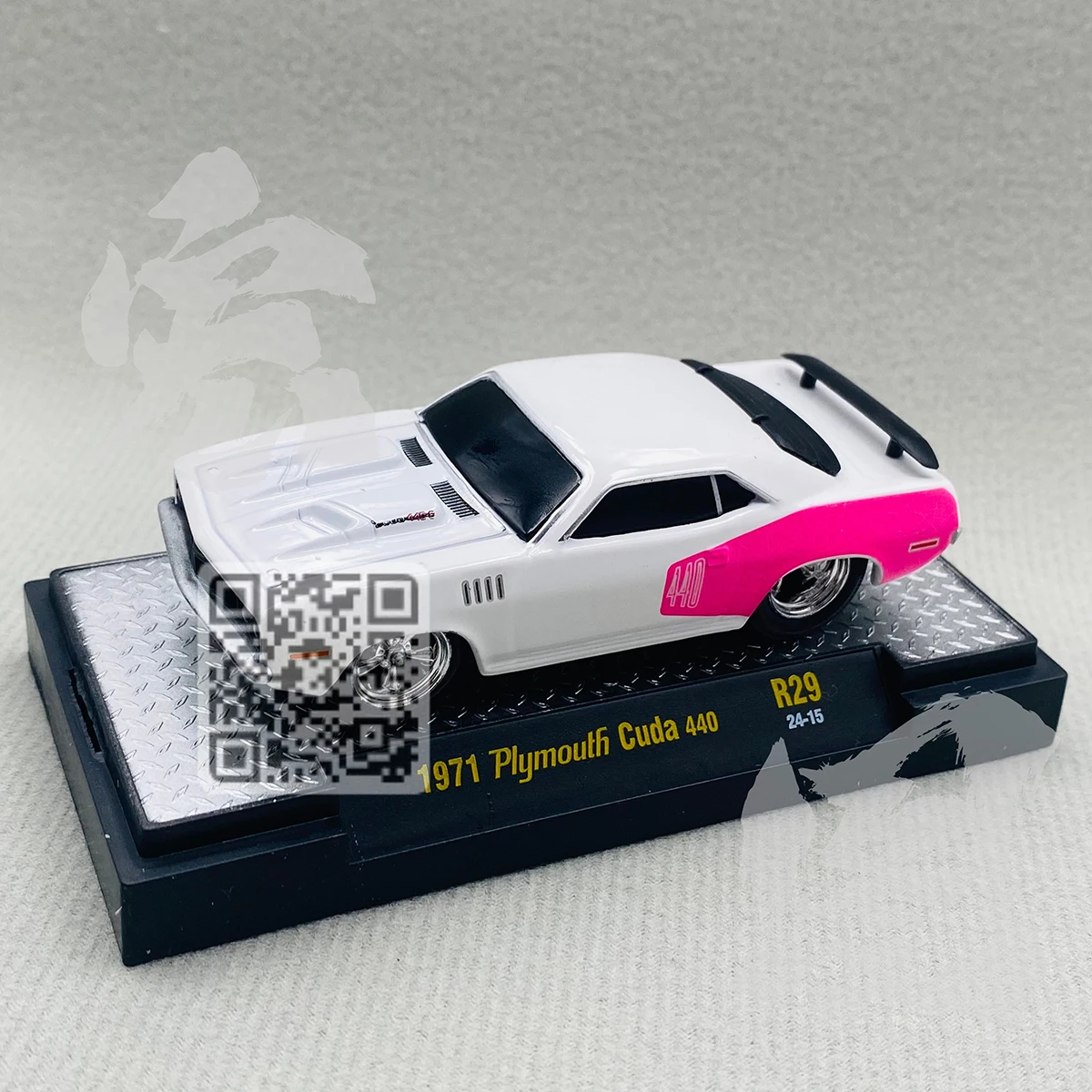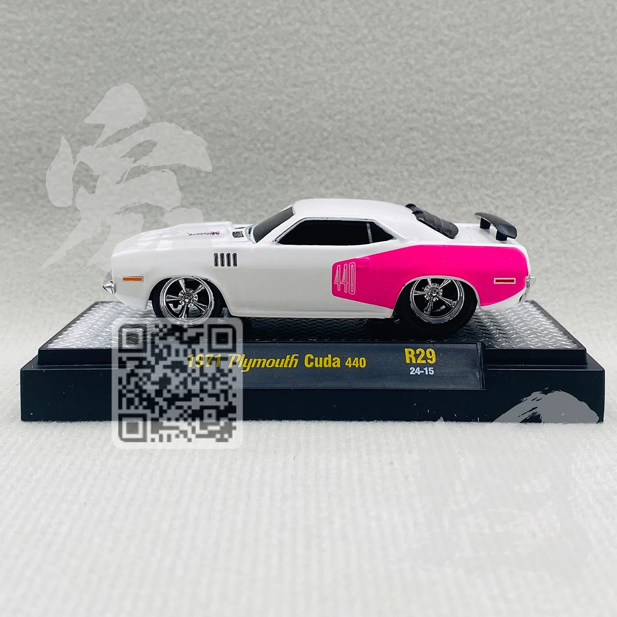 Celebrate the muscle car era with this beautifully crafted 1:64 scale diecast replica of the 1971 Plymouth Cuda 440. Perfect for collectors, this model combines excellent detailing with high-quality alloy and ABS plastic materials. Its sleek, compact design features a smooth white finish highlighted by striking pink side panels, creating a dynamic two-tone aesthetic. Meticulously crafted to resemble the original, the model showcases a sculpted hood, a prominent grille, and detailed headlamps. Silver rims on realistic black tires, tinted windows, subtle side trim, and a rear spoiler enhance its authentic look. Whether displayed on a shelf or used as a captivating collectible, this model captures the true spirit of 70s muscle car craftsmanship.
