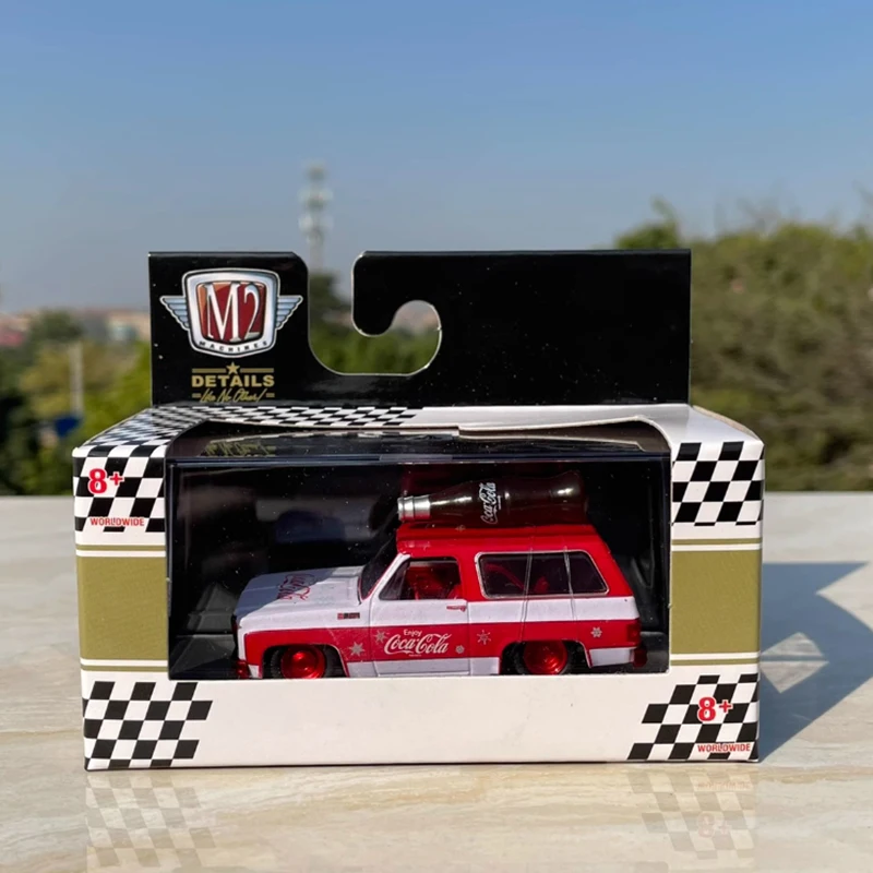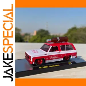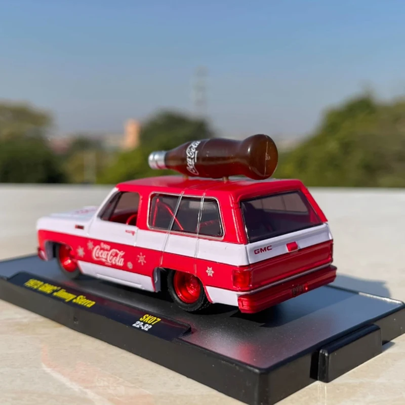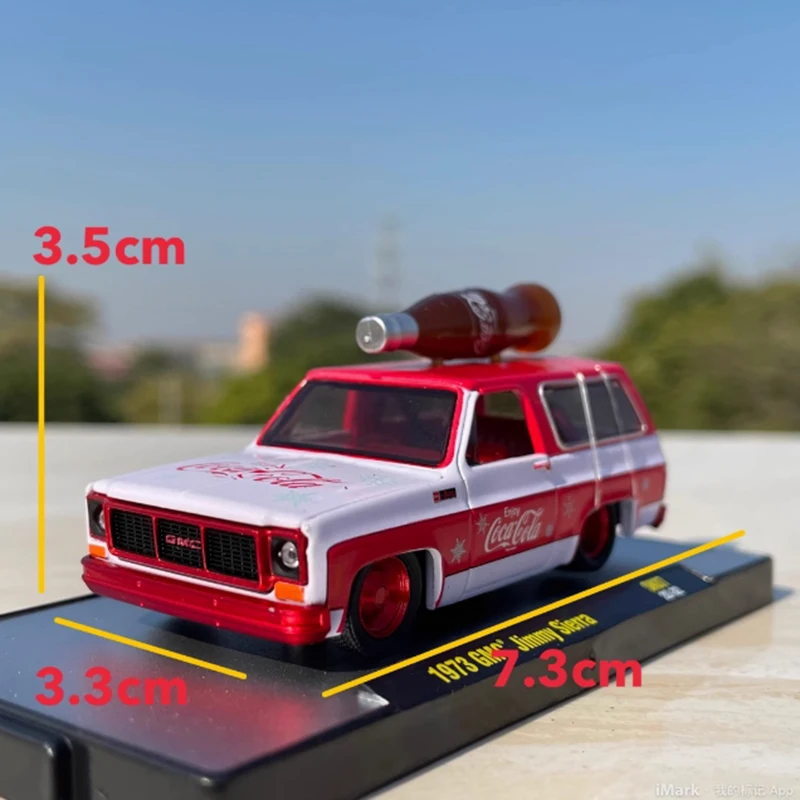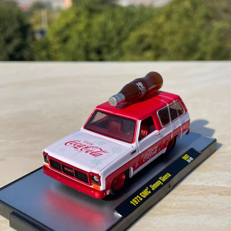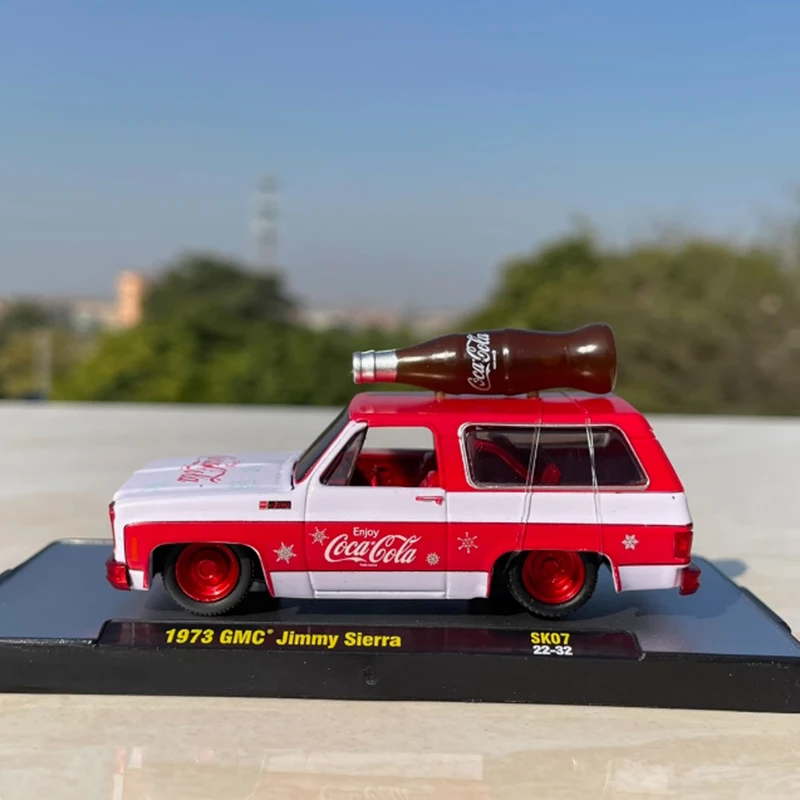 - Officially licensed 1:64 scale diecast model of a 1973 GMC Jimmy Sierra with vibrant Coca-Cola branding for collectible display.