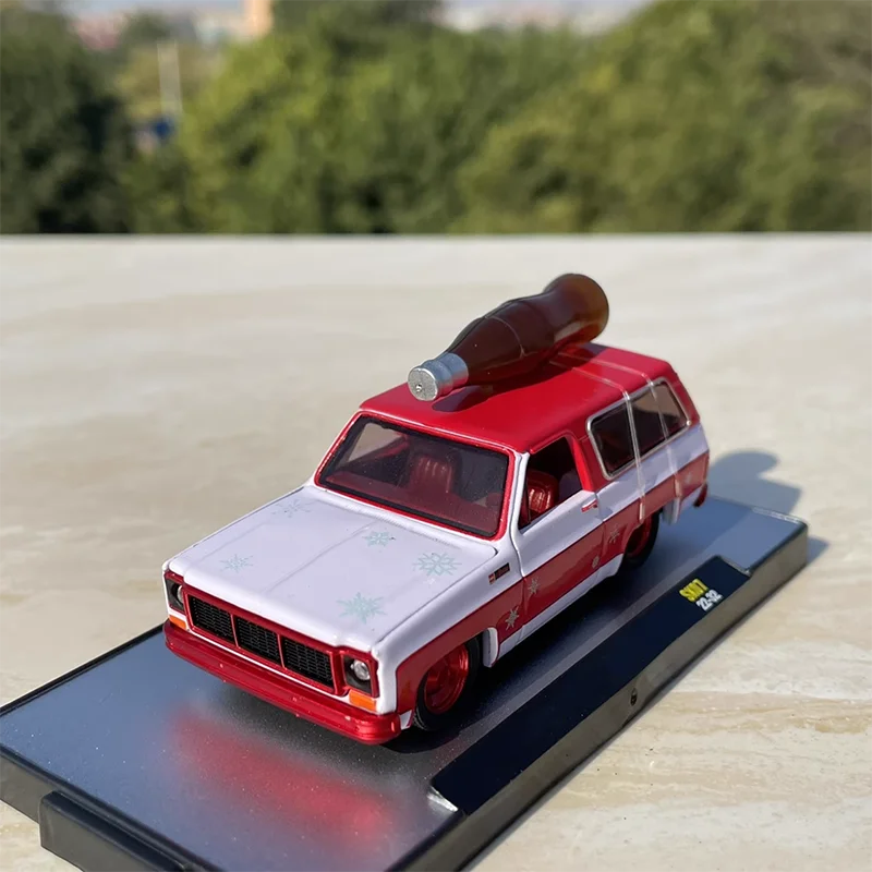 Step into the world of vintage collectibles with this meticulously crafted diecast model of the 1973 GMC Jimmy Sierra off-road vehicle. Designed at a 1:64 scale, this detailed replica captures the classic SUV’s rugged aesthetic while adding a playful Coca-Cola themed livery. The vehicle features a glossy white finish on the roof and hood, complemented by bold red side panels adorned with white horizontal bands, white snowflakes, and the iconic Coca-Cola logo with the word “Enjoy”. A miniature Coca-Cola glass bottle mounted on the roof adds a whimsical touch. Its sturdy metallic construction provides both visual appeal and durability, making it perfect for display, collection, or gifting. The model’s darkened windows and contrasting small details contribute to its realistic charm, allowing you to showcase a retro vehicle with a festive twist in your collection.
