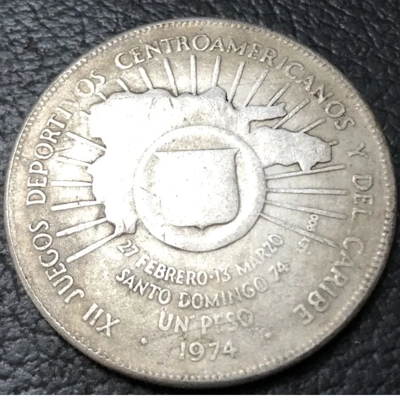 Experience the charm of history with this intricately designed cast metallic coin, inspired by the 1974 Dominican Republic 1 Peso coin. Crafted between 1960 and 1979, it boasts an antique European style, rich in patriotic symbolism. The coin’s surface features a weathered patina, enhancing its vintage appeal. The central emblem, a square with rounded corners, is surrounded by radiant sunburst lines, creating a striking focal point. Fine engraving details, including regional inscriptions like “JUEGOS DEPORTIVOS CENTROAMERICANOS Y DEL CARIBE,” and the event dates add authenticity and intricate craftsmanship. The dotted border around the edge complements its ornate, historic aesthetic, making this piece perfect for collectors and enthusiasts who appreciate aged, European-inspired memorabilia.