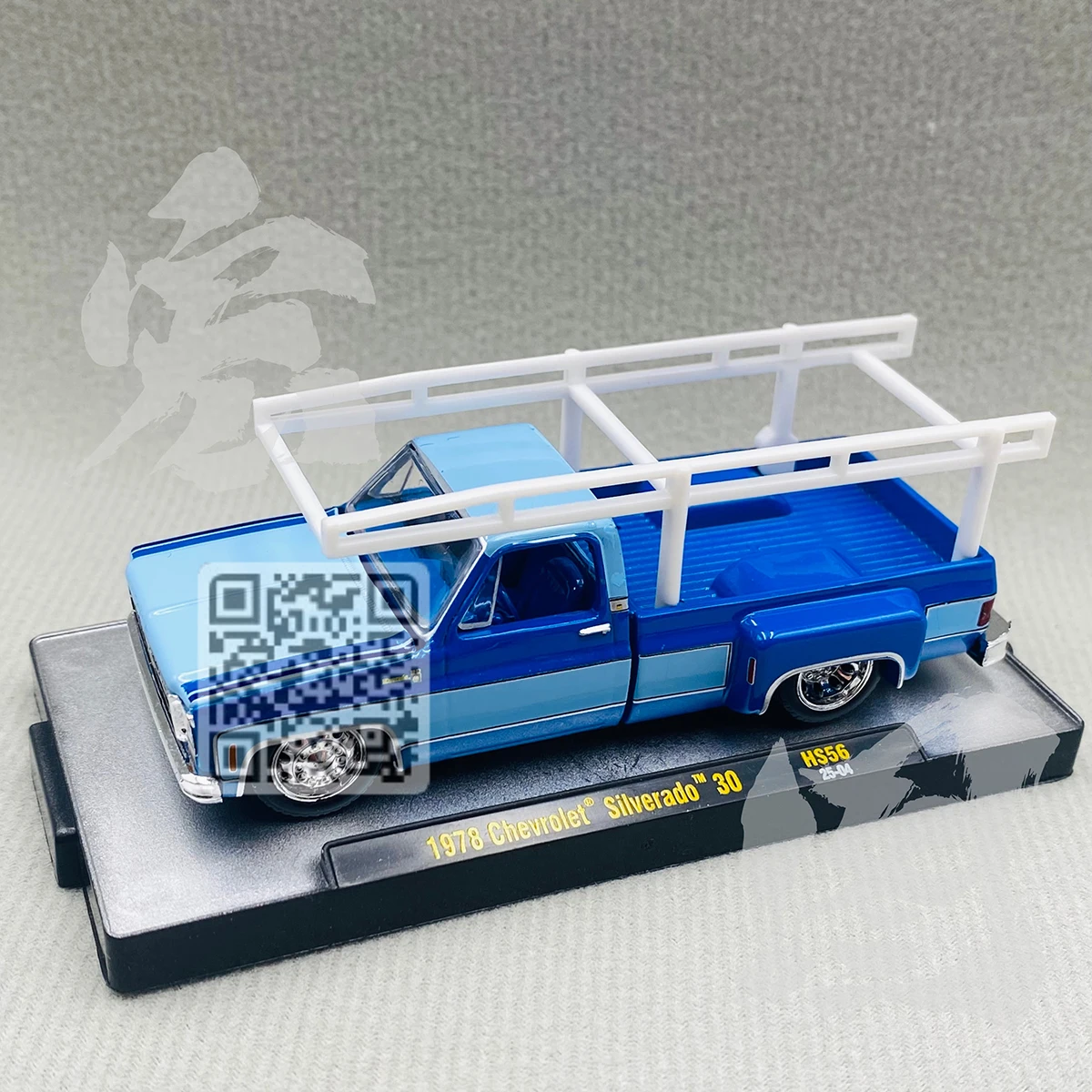 Imagine yourself owning this stunning miniature replica of the 1978 Chevrolet Silverado, beautifully finished in a vibrant, glossy blue. Crafted with exceptional precision, the model captures the essence of the original truck's design, from the intricately molded body panels to the realistic front grille and headlights. The sharply defined clear windows reveal a detailed interior, while the slightly curved roofline and side mirrors authentically reflect the vintage style. The standout feature is the white ladder rack with a grid pattern that extends above the cab, adding visual contrast and authenticity. Sitting on a simple black base, this model is ideal for display, evoking a sense of nostalgia and craftsmanship that any collector will appreciate and cherish. Bring home this perfect snapshot of vintage Americana and elevate your collection today.