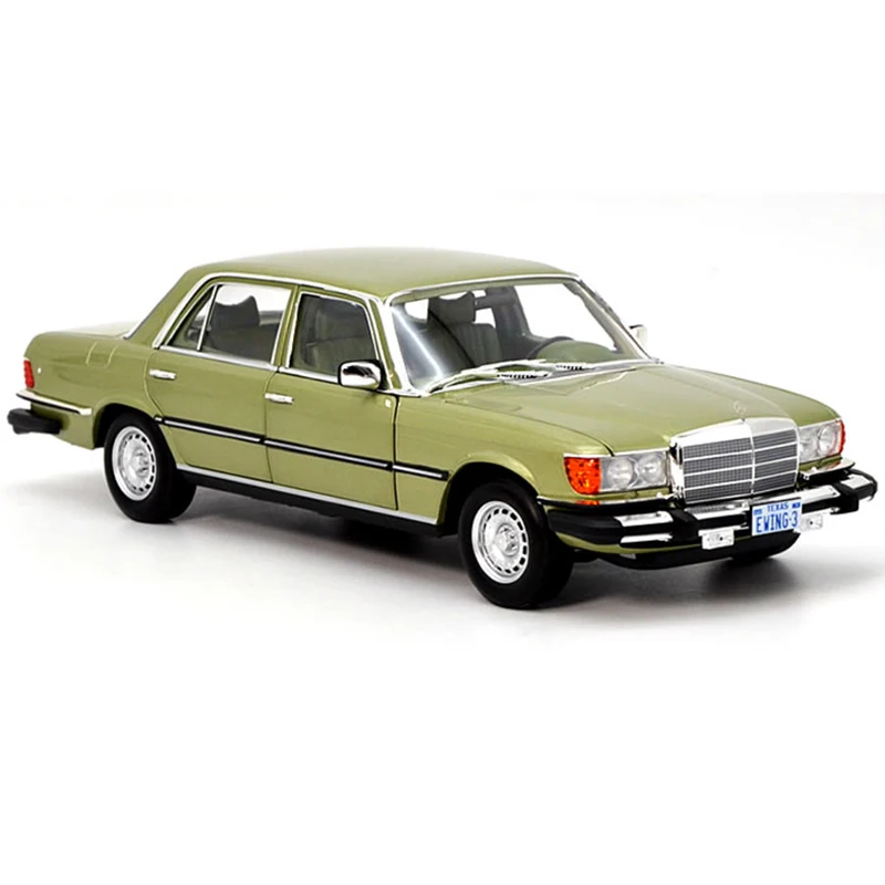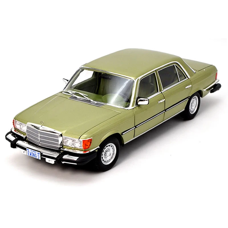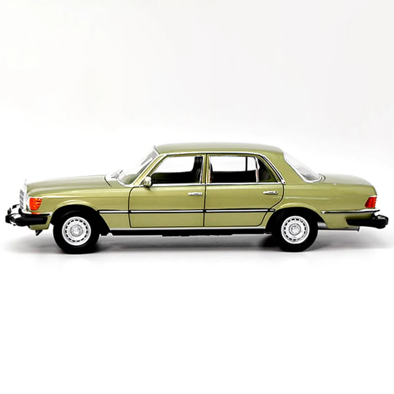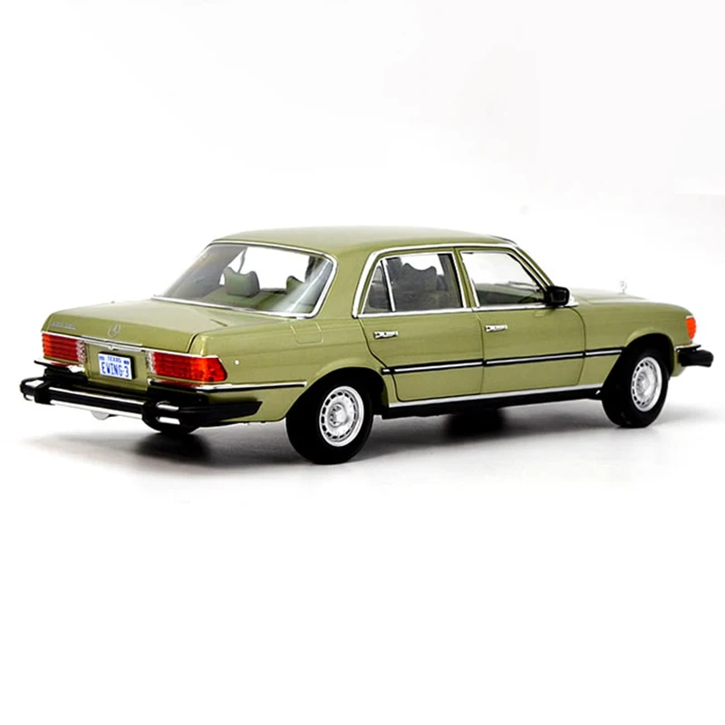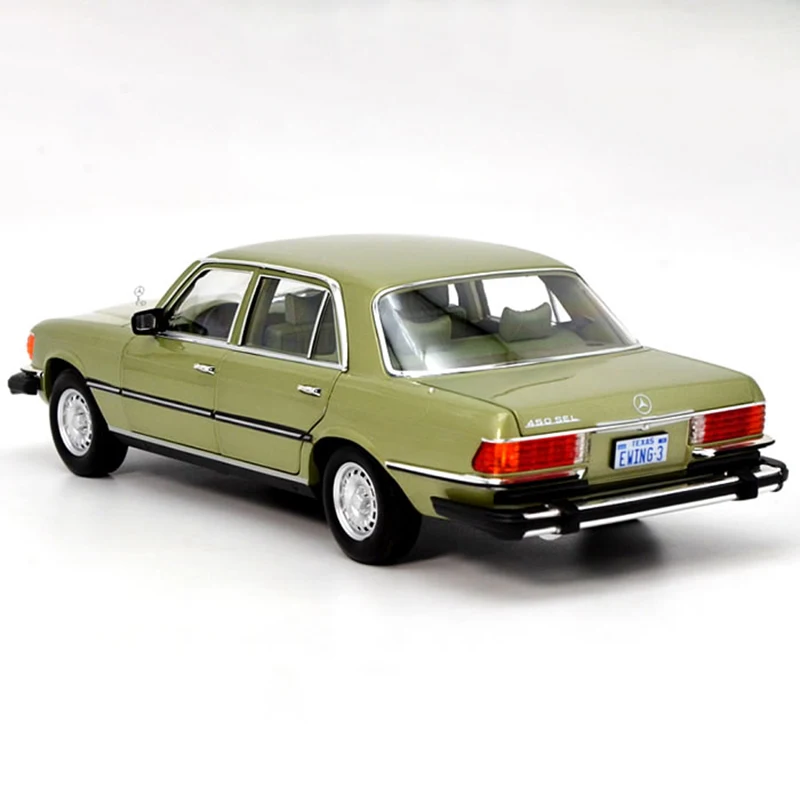 Step into the world of vintage luxury with this meticulously crafted 1:18 scale diecast model of the 1979 US-version Mercedes-Benz 450 SEL. Realistically painted in a stunning metallic green, it captures the elegance and robust presence of the original vehicle. Its precise proportions and detailed design bring nostalgia to life, from the classic four-door sedan silhouette with a boxy profile to the shiny chrome accents and authentic front grille featuring the iconic Mercedes-Benz emblem. With high-quality die-casting craftsmanship, this model showcases true-to-life details like rectangular headlights, taillights with red and white sections, silver hubcaps, and clear plastic windows offering a glimpse of the detailed interior. Perfect for collectors and enthusiasts alike, it guarantees a remarkable display piece that exudes sophistication and vintage charm.