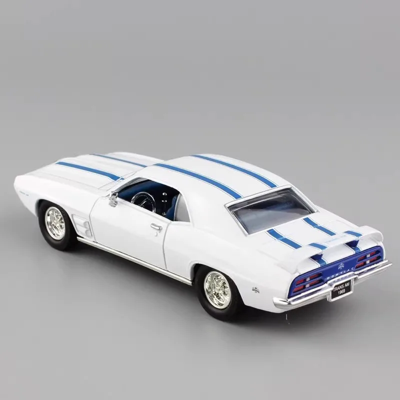 - Produced with durable alloy material, the model features glossy black and white finishes, with the white variant showcasing bold blue racing stripes, adding vibrancy and visual appeal to your display.