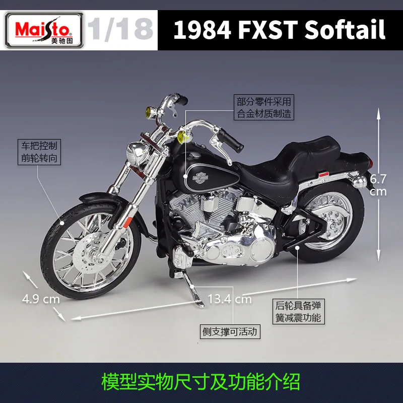 - This 1:18 scale diecast motorcycle model features a matte black finish, accented with shiny chrome and silver, emphasizing a modern, sophisticated aesthetic authentic to the 1984 FXST Softail Harley.