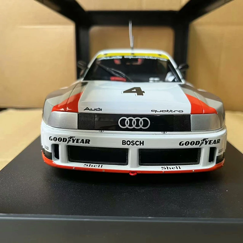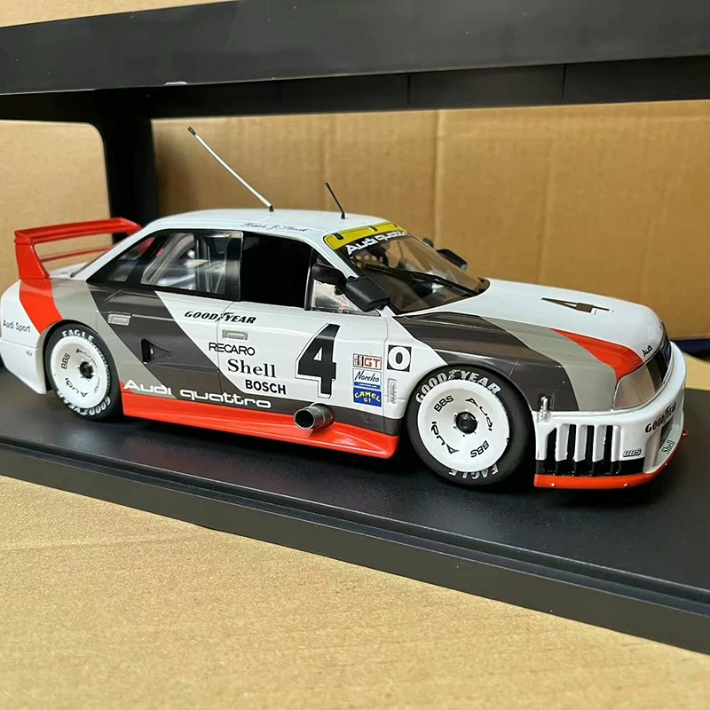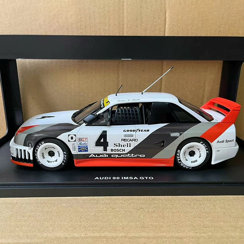 Step into the world of racing with this highly detailed 1:18 scale diecast alloy model of the iconic 1989 GTO #4. Measuring approximately 10.8″ long, this replica captures the sleek, aerodynamic design of the original car, featuring smooth flowing lines and a low-slung profile that exudes speed and elegance. The vehicle showcases a crisp white base color, accented with bold black, gray, and vibrant orange racing graphics. Bright orange details on the rear wing spoiler and front bumper add energetic touches. The large black center section with sponsor logos enhances its aggressive appearance. The transparent windows reveal an interior with a racing seat and red harness, adding realism and depth perfect for display. Despite minor paint imperfections at the rear, this model remains an attractive addition to any collection.