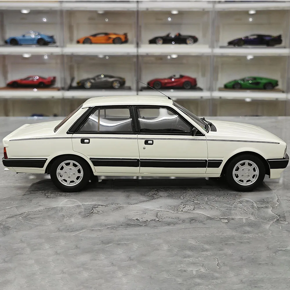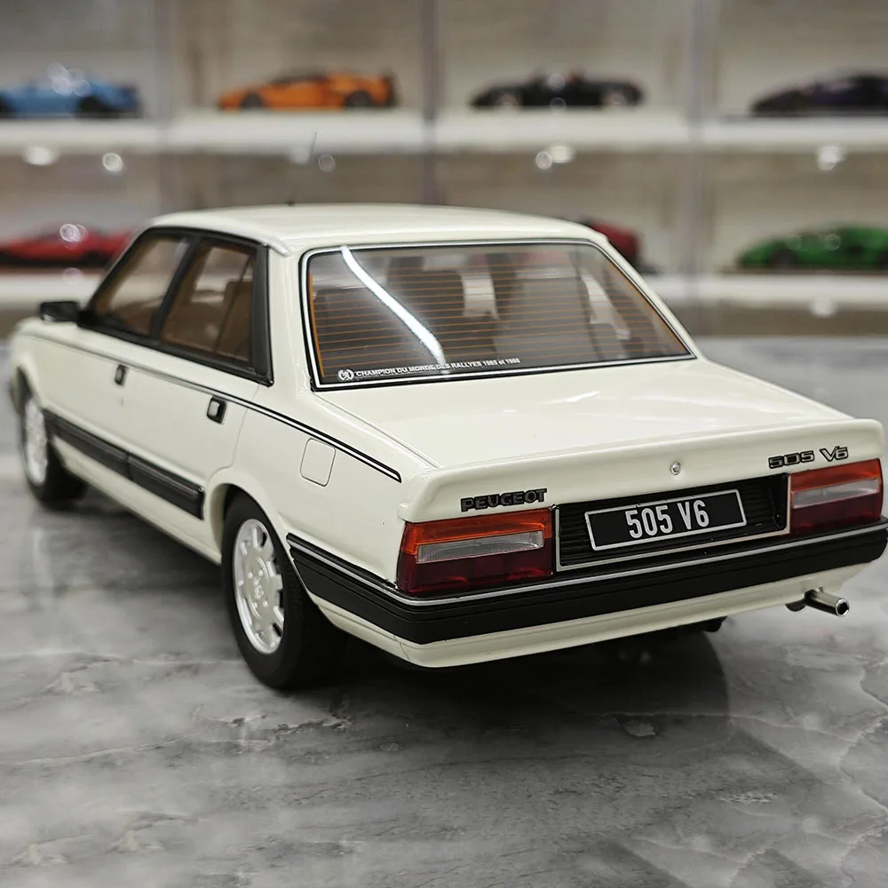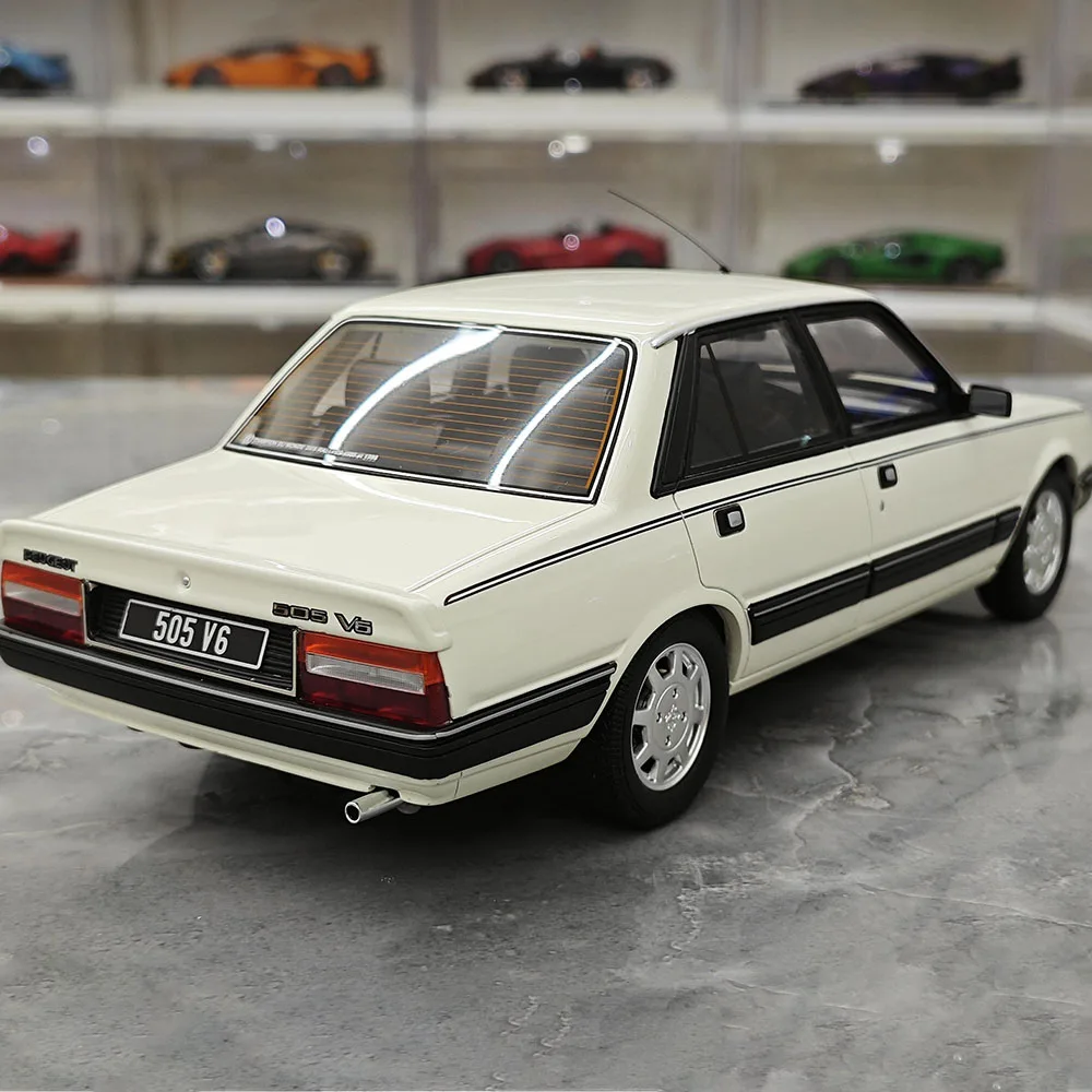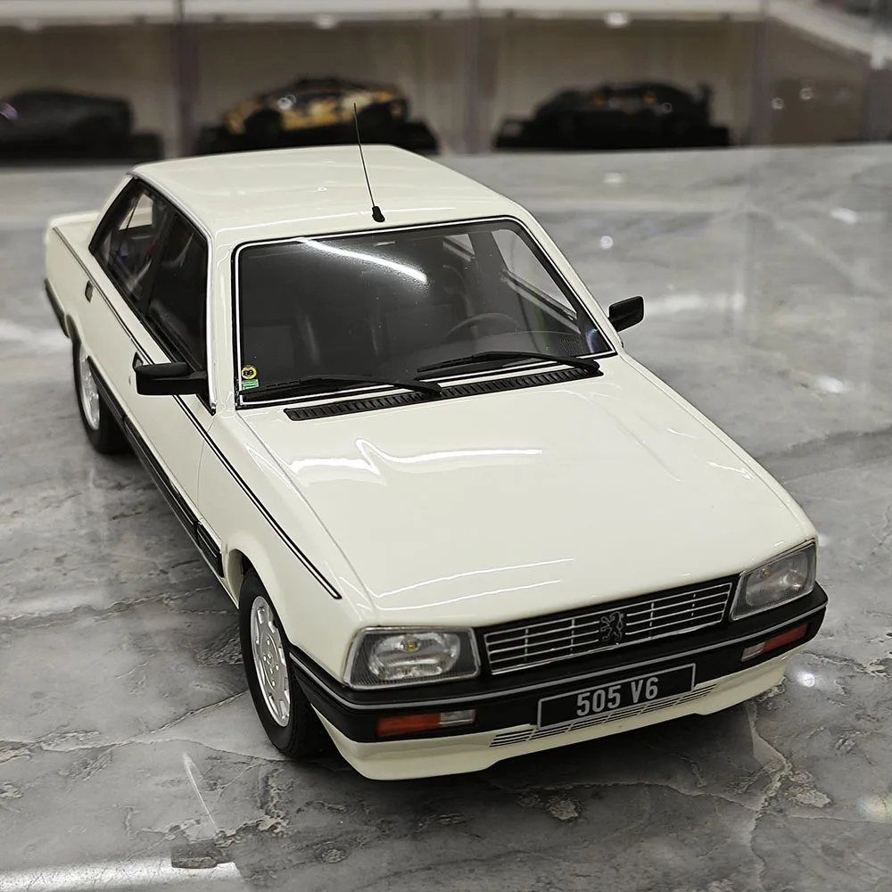 Imagine showcasing this exquisite 1:18 scale model of the iconic 1989 Peugeot 505 V6. Crafted with meticulous attention to detail, it boasts a sleek white resin body accented with contrasting black trim on windows, door handles, side mirrors, and a distinct black stripe along its lower sides. The silver front grille with the Peugeot lion emblem, rectangular clear headlights with integrated orange turn signals, and multi-spoke silver rims with realistic black rubber tires add to its authentic appeal. This collectible model captures the streamlined roofline, subtle black antenna, and finely painted details like door panels and license plates. Perfect for display or gifting, it embodies elegance and precision, making it a must-have for automotive enthusiasts and collectors alike.