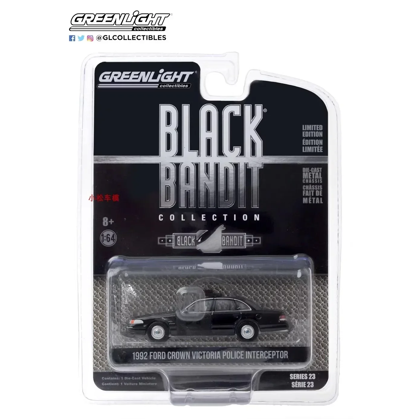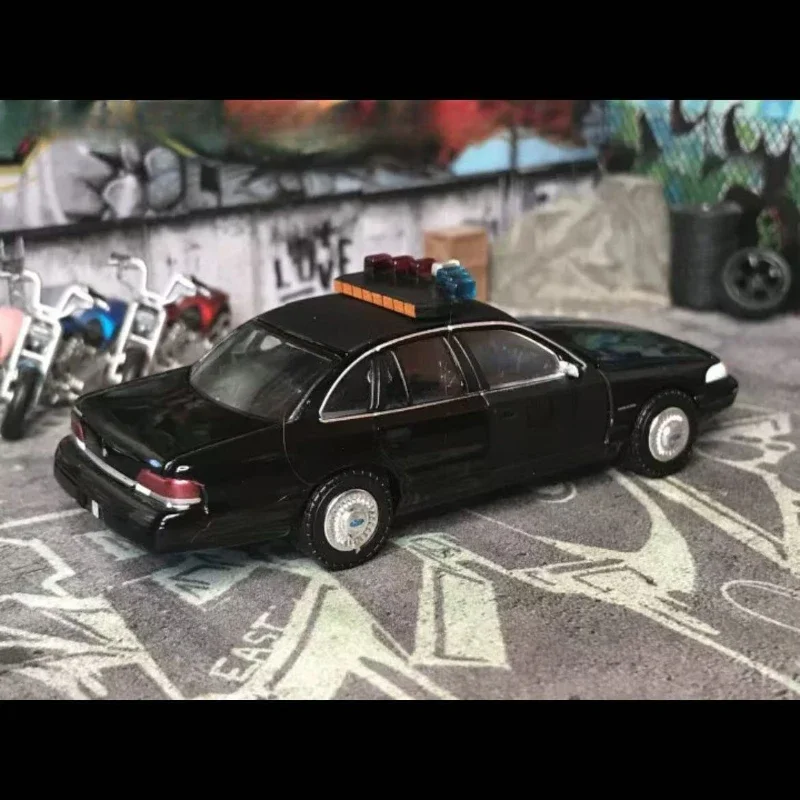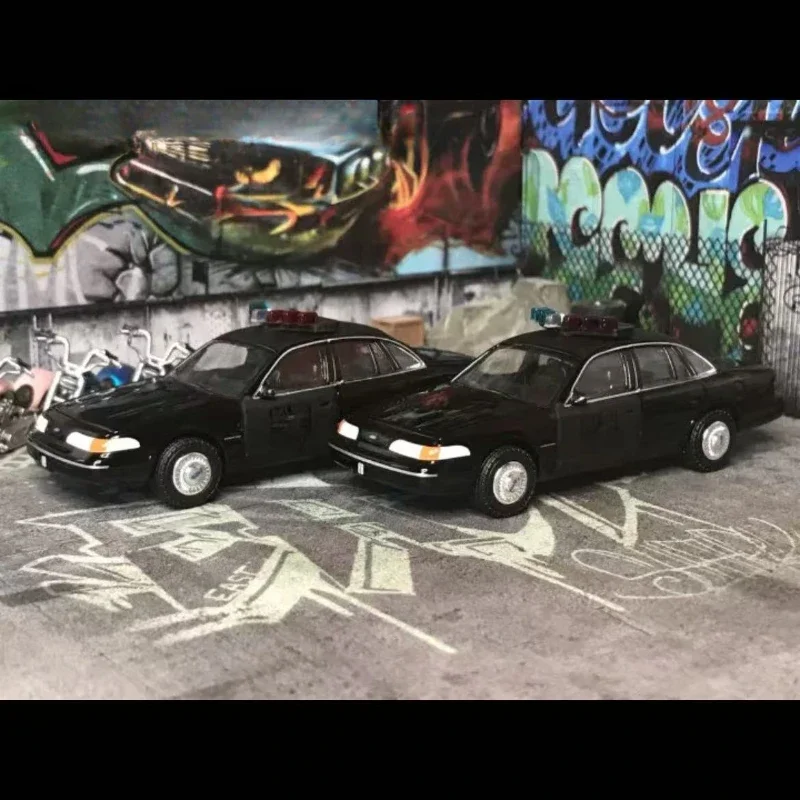 This 1:64 scale diecast model of the 1992 Ford Crown Victoria Police Interceptor showcases a sleek black finish with a glossy surface, highlighting its classic contours. The model features a detailed front grille with a blue Ford emblem, well-defined headlights with contrasting white detailing, and black-painted windows accented by thin chrome trim. Authentic police insignias are depicted on the doors, while the top boasts a light bar featuring two distinct blue lights. The durable wheels have a realistic tread design and chrome hubcaps. Crafted entirely from metal, this non-electric model requires no batteries, making it an ideal collectible for enthusiasts.