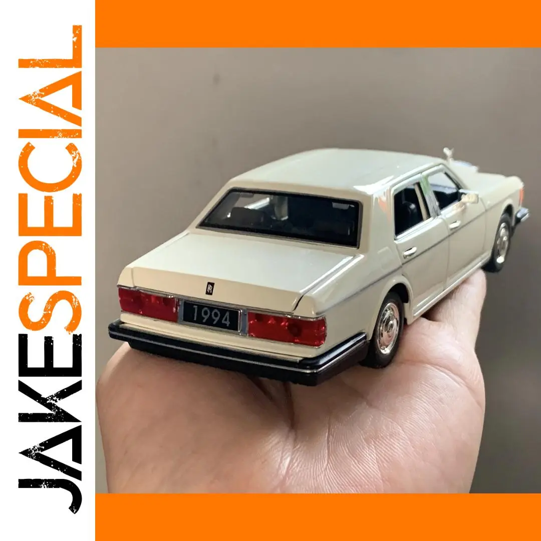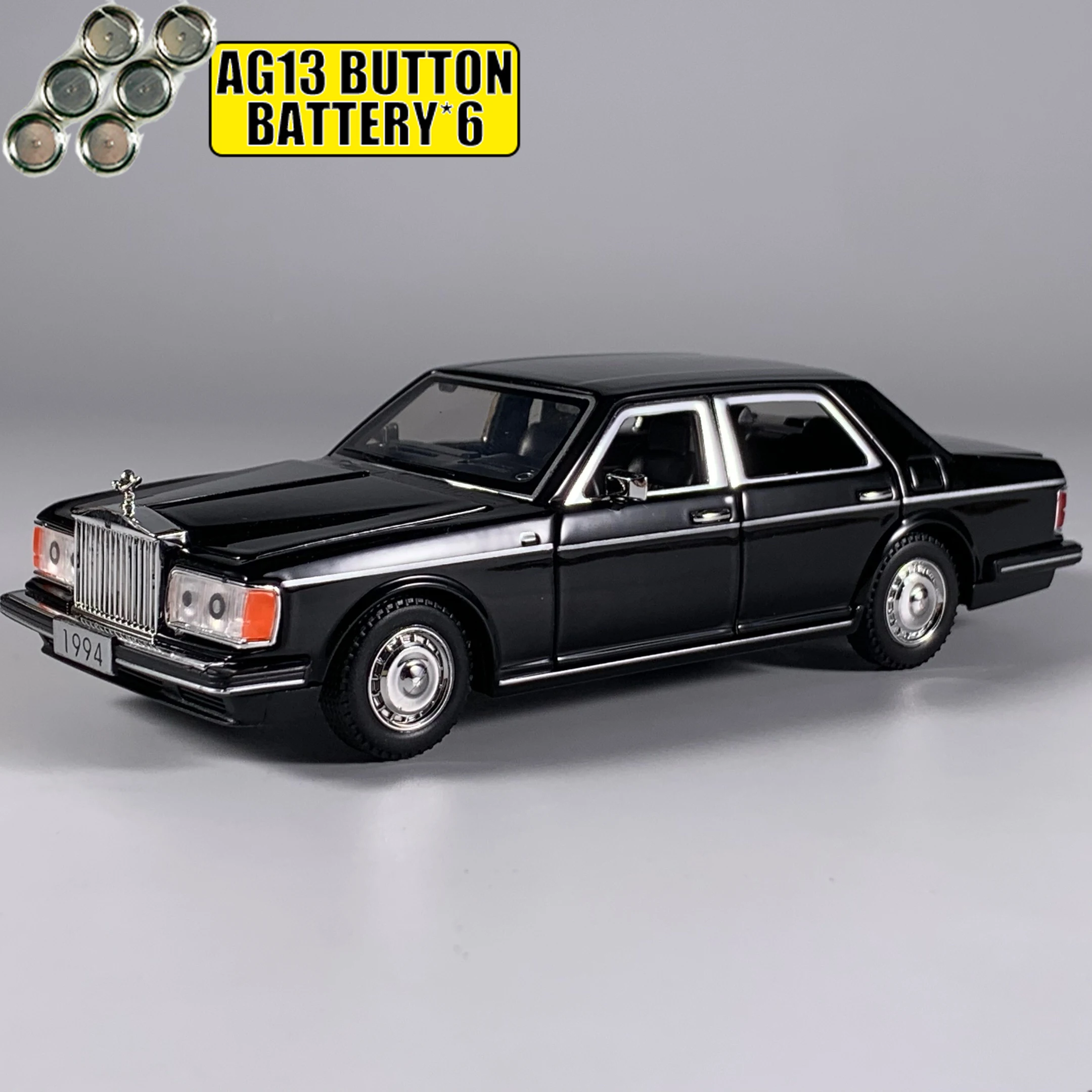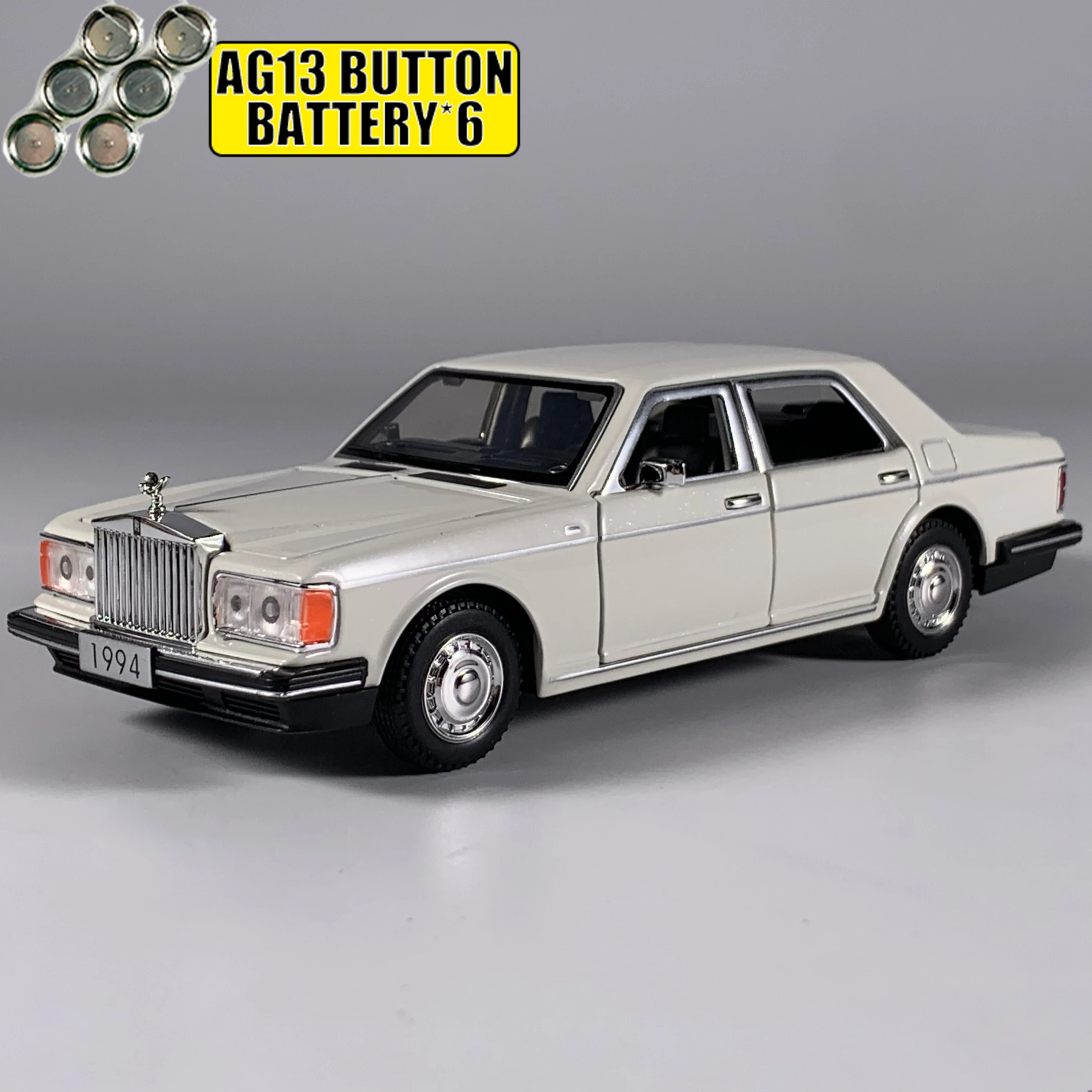 This 1:32 scale diecast model of the 1994 Rolls Royce Silver Spur Limousine is a detailed metal replica featuring authentic luxury design elements. It includes sound and light effects operated by a pull-back mechanism and is powered by button batteries. Available in elegant colors such as white, black, gold, and green, with special versions like AG13 and boxed editions, this collectible model captures the classic rectangular shape, chrome accents, transparent windows revealing interior details, and a distinctive rear taillight assembly. Perfect for adult collectors, it combines refined craftsmanship with realistic features, making it a sophisticated addition to any collection.