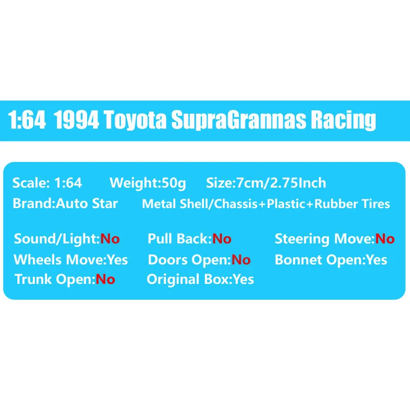 - Highly detailed 1/64 scale diecast metal model, capturing the sleek, sporty design of the 1994 Toyota Supra Grannas Racing with authentic aerodynamic features.