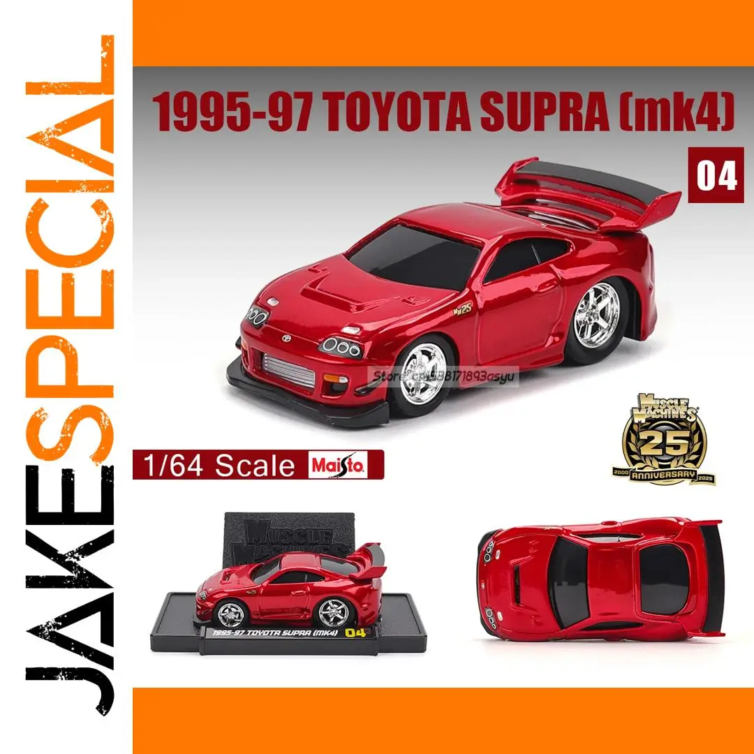 - High-quality diecast construction with a vibrant glossy red finish, showcasing exceptional detailing of the iconic 1995-97 Toyota Supra MK4, perfect for display and collectible enthusiasts.