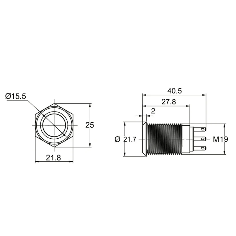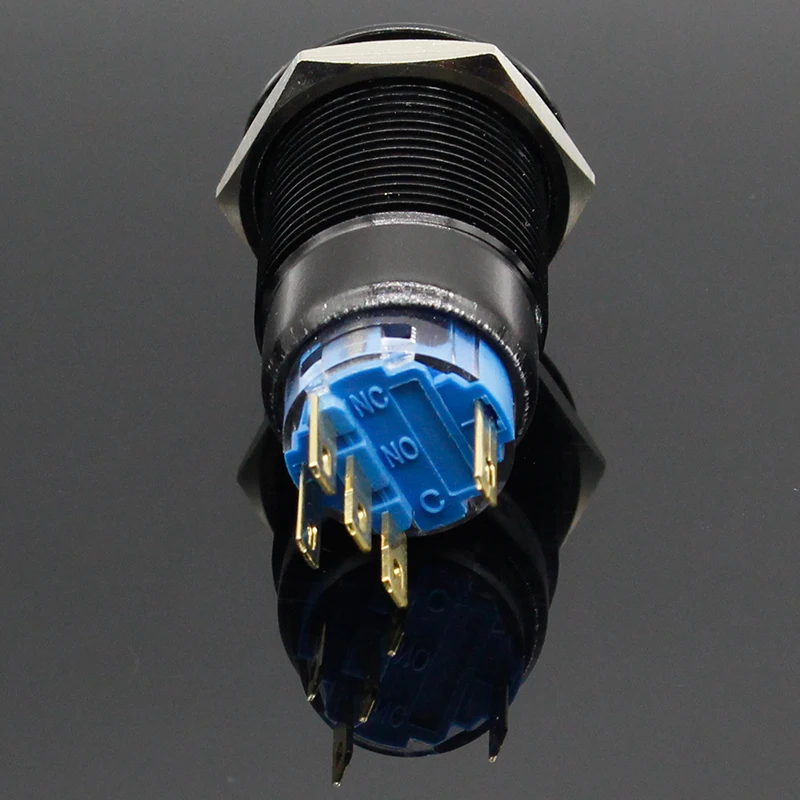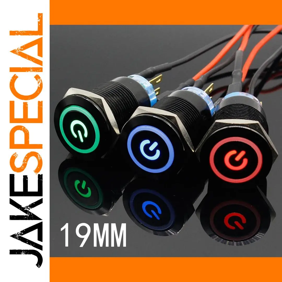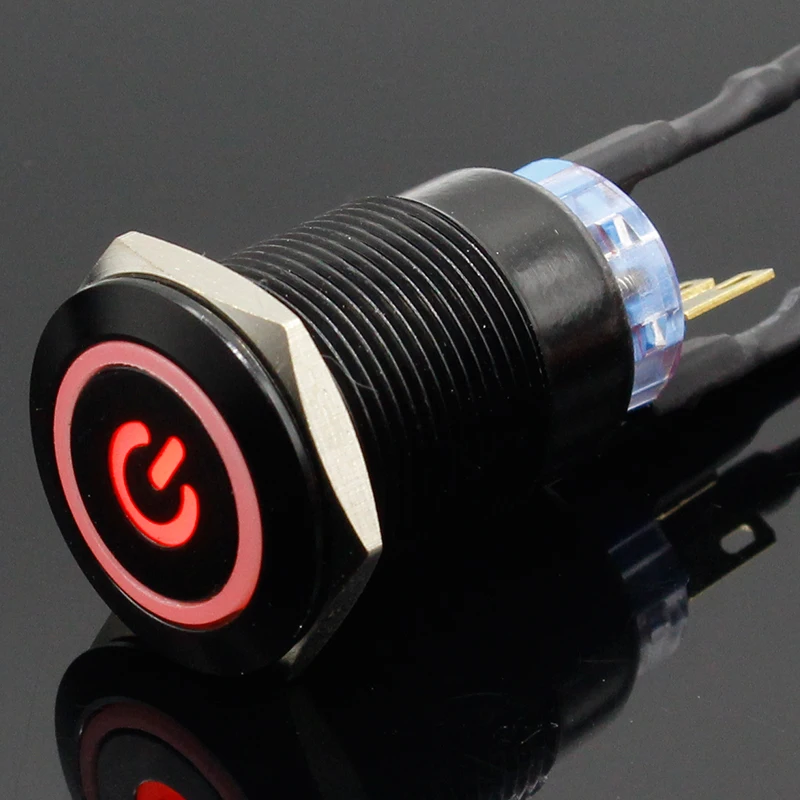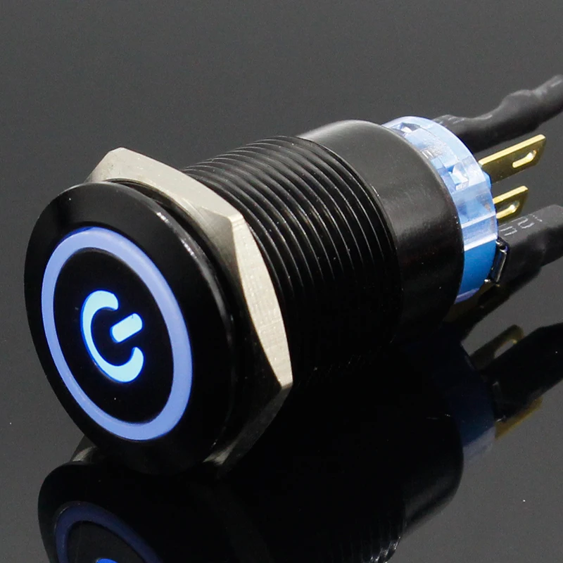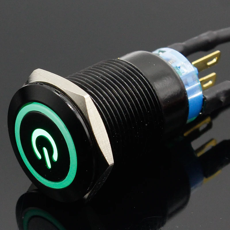 Enhance your electronic projects with this 19mm stainless steel push button switch, available in momentary and latching (locking) types. Crafted from durable stainless steel with a sleek, textured black ribbed finish, it features an octagonal alumina black press button marked with a power symbol illuminated by vibrant LEDs in green, red, blue, yellow, and white. Supporting voltage options of 5V, 12V, 24V, and 220V, it delivers a 5A current rating and waterproof protection for reliable operation. Ideal for professional and hobbyist applications, this switch combines modern aesthetics with robust technical performance, making it a perfect choice for high-quality control panels and custom setups.