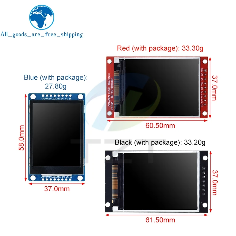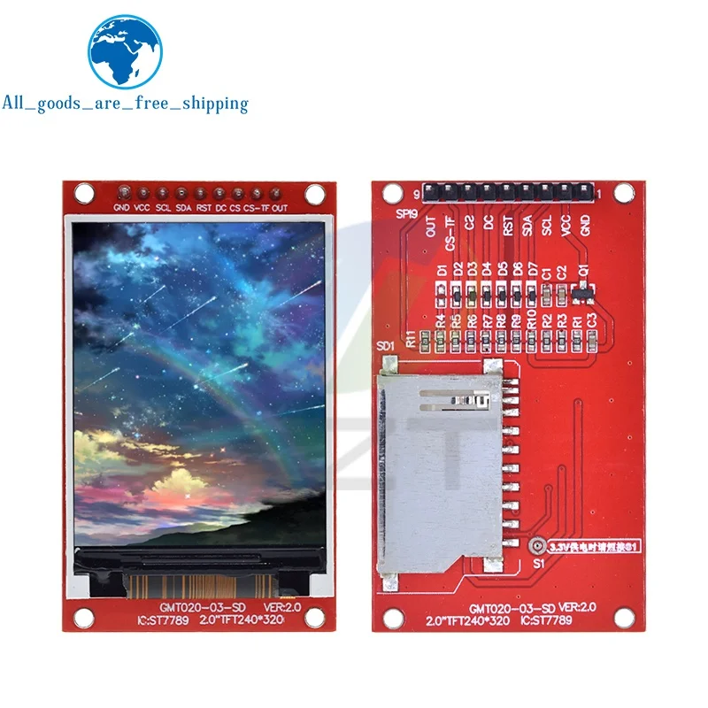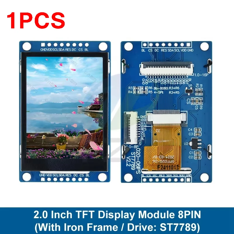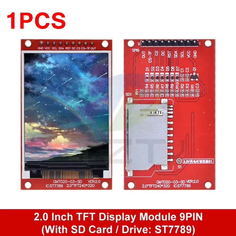 - Technical specifications include a 2.0-inch display size, 240×320 pixels resolution, and an OLED LCD Drive IC ST7789V, ideal for high-quality graphic outputs.