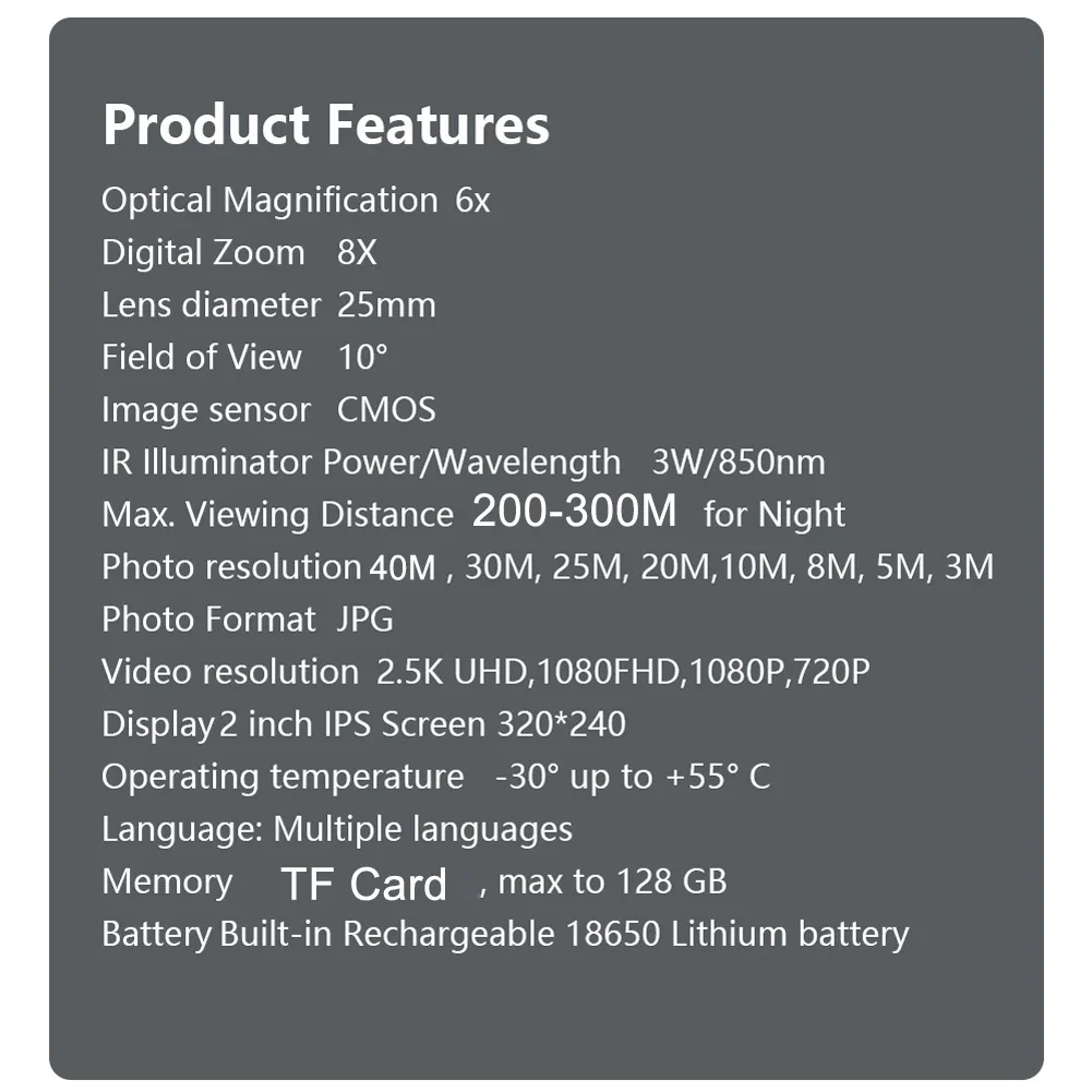 This 2.5K Digital Night-Vision Monocular is not just a tool; it's your gateway to unparalleled night-time adventures. With stunning 40MP photo capture and the ability to record 2.5K video, every moment is immortalized in crisp detail. The compact design, finished in matte black, serves both style and functionality, while a textured grip ensures comfortable handling. Featuring a 2-inch IPS screen, smooth zoom functions, and adjustable infrared illumination, this device makes nighttime explorations captivating. Rain or shine, this monocular withstands the elements, making it the perfect companion for camping, fishing, and wildlife observation.