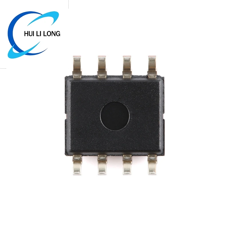 - Package in SOP-8 form factor with eight metallic leads protruding at right angles for easy surface-mount installation on printed circuit boards.