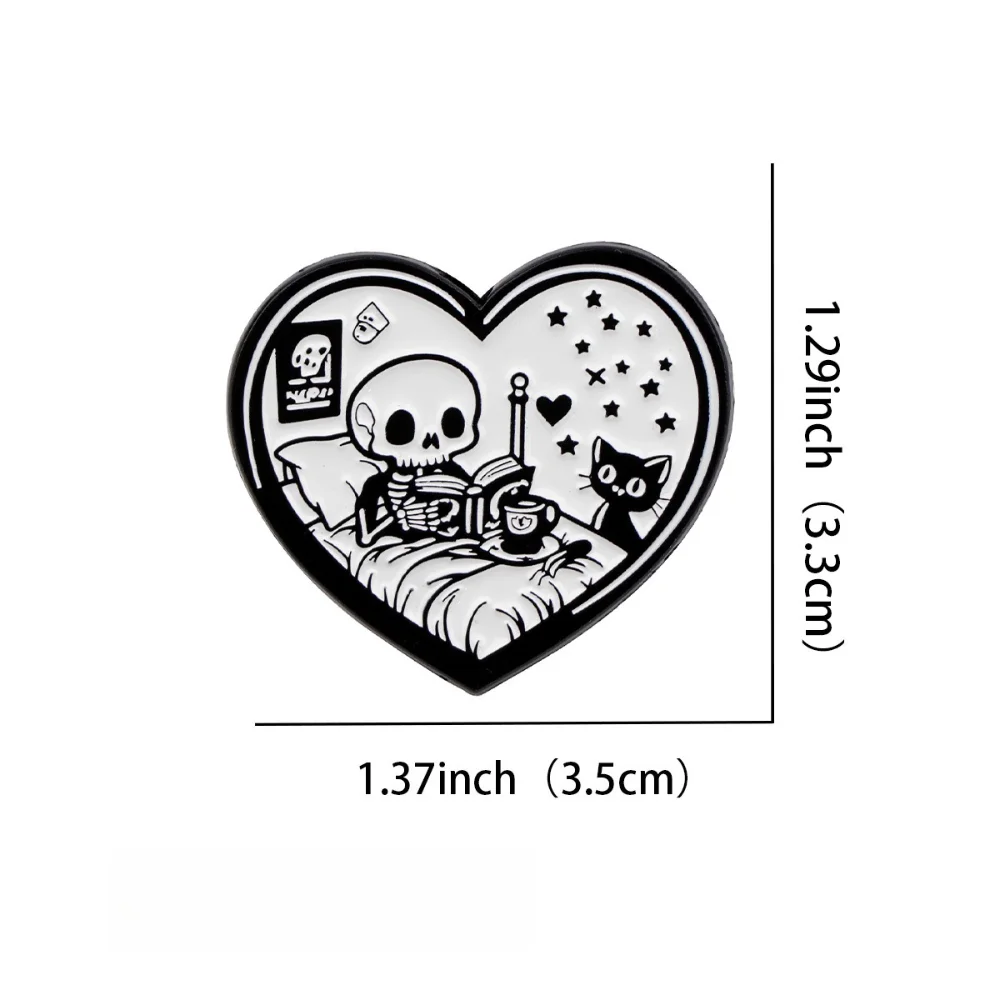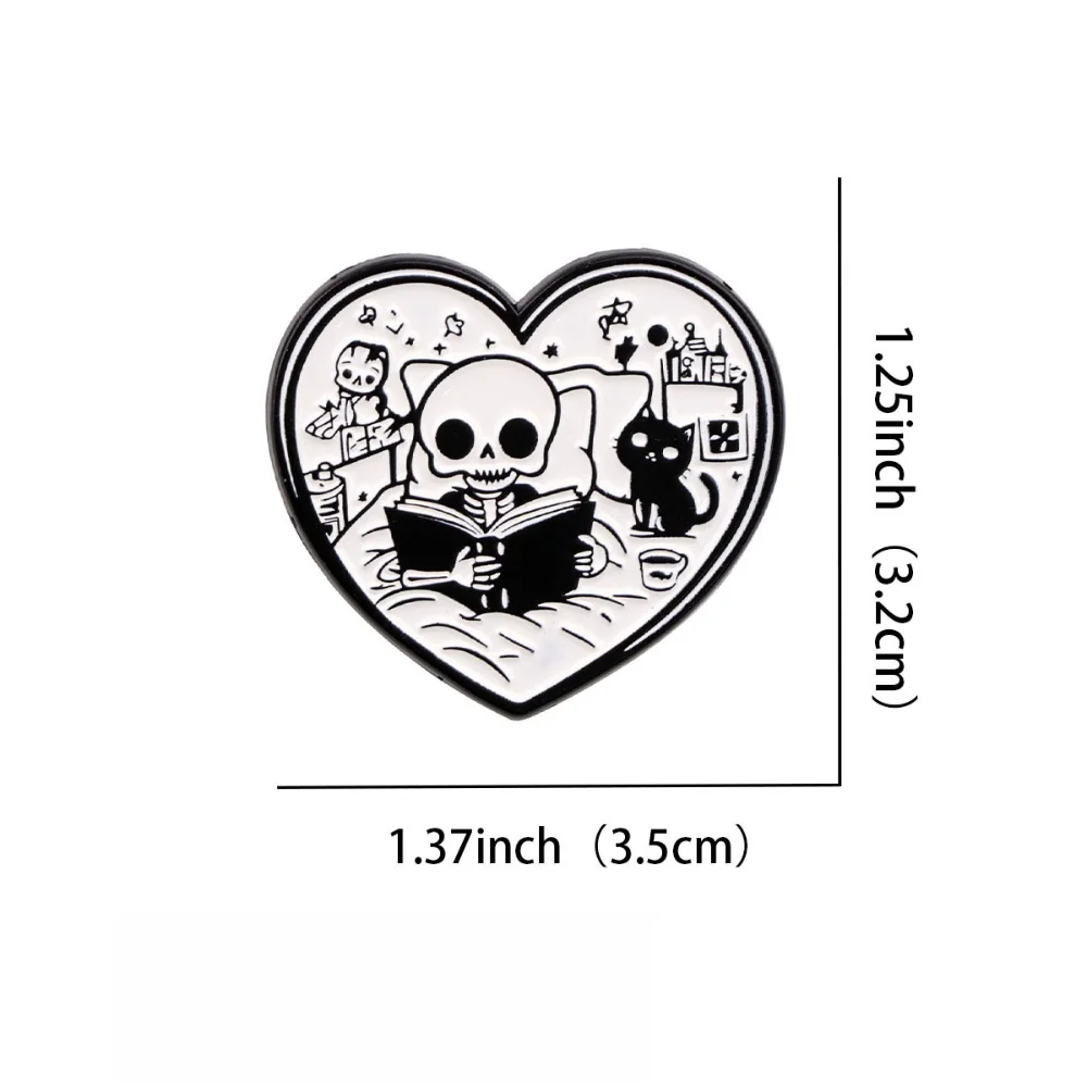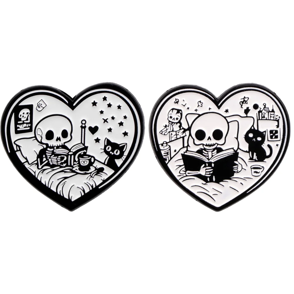 Introducing the 2 Piece Skeleton Nerd Kitten Brooch set, made from durable alloy with a striking black and white design. Each heart-shaped brooch features whimsical cartoon illustrations: one depicting a relaxed skeleton in a striped shirt with a charming black cat, and the other showing a cheerful skeleton sitting up, book in hand, alongside another black cat and an animated character. Perfect for adding a touch of fun and gothic flair to your style, this unisex accessory is suited for jackets, backpacks, hats, and DIY projects. Size deviations of 1-3mm may occur. Embrace your playful side!