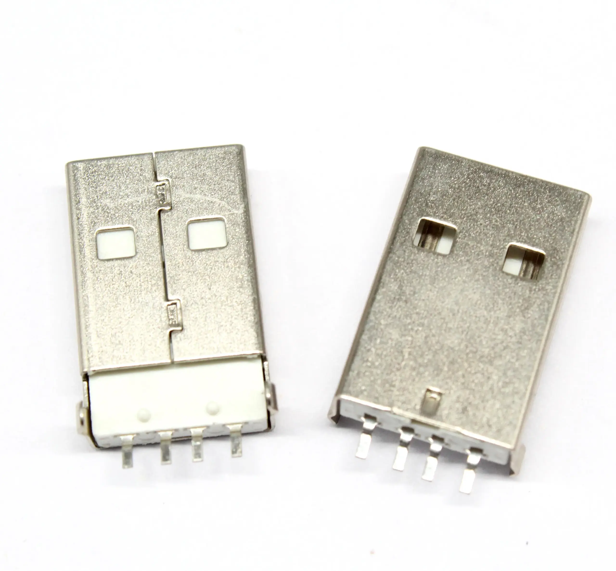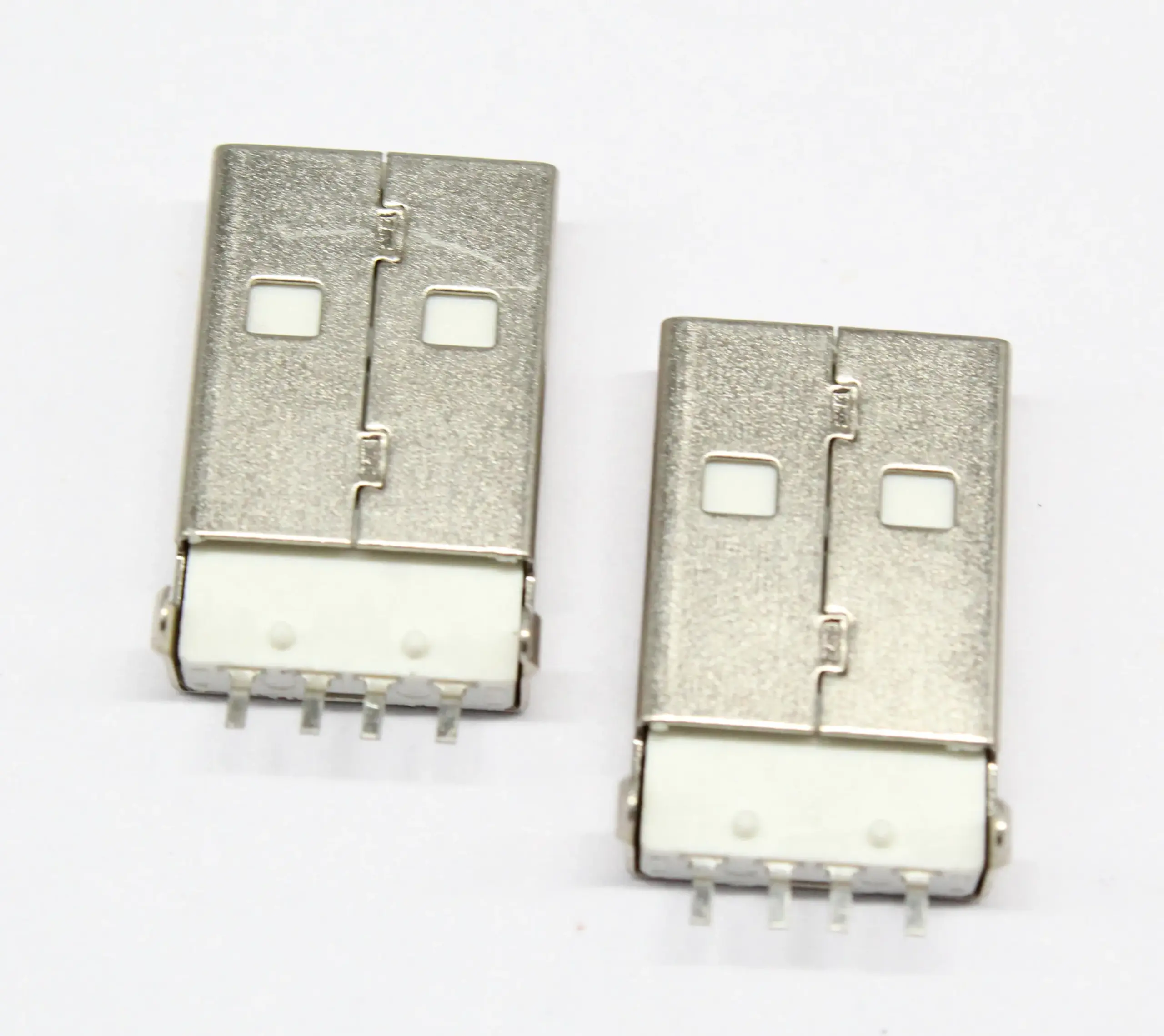 Enhance your electronic projects with this set of 20 high-quality USB Type A male SMD connectors featuring a 4-pin design for data transfer and U disk connections. Crafted with a sleek metallic silver finish, each connector boasts a precise rectangular shape with subtle notches and cutouts for secure attachment and reliable soldering. The white plastic insulator inside contrasts with the shiny exterior, emphasizing a modern, minimalist aesthetic. These new, customized connectors are compatible with standard USB A ports and are ideal for various electronic applications where dependable data interfaces are essential, providing both functionality and a clean technical look to your circuit designs.