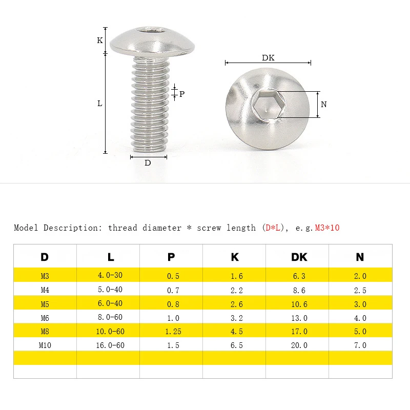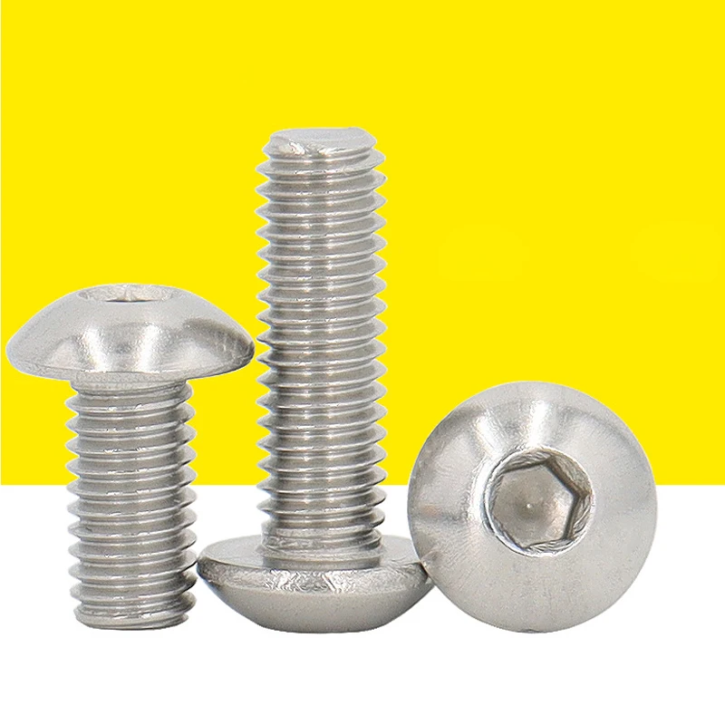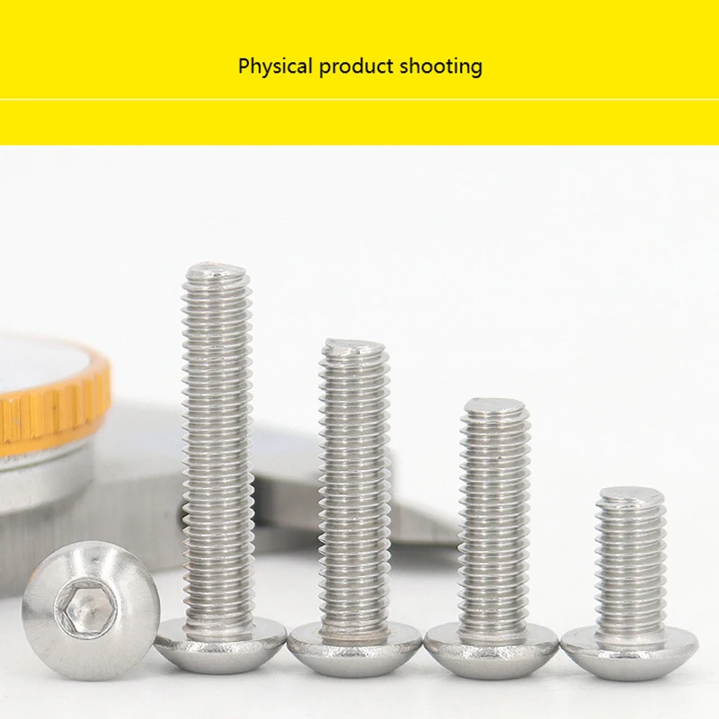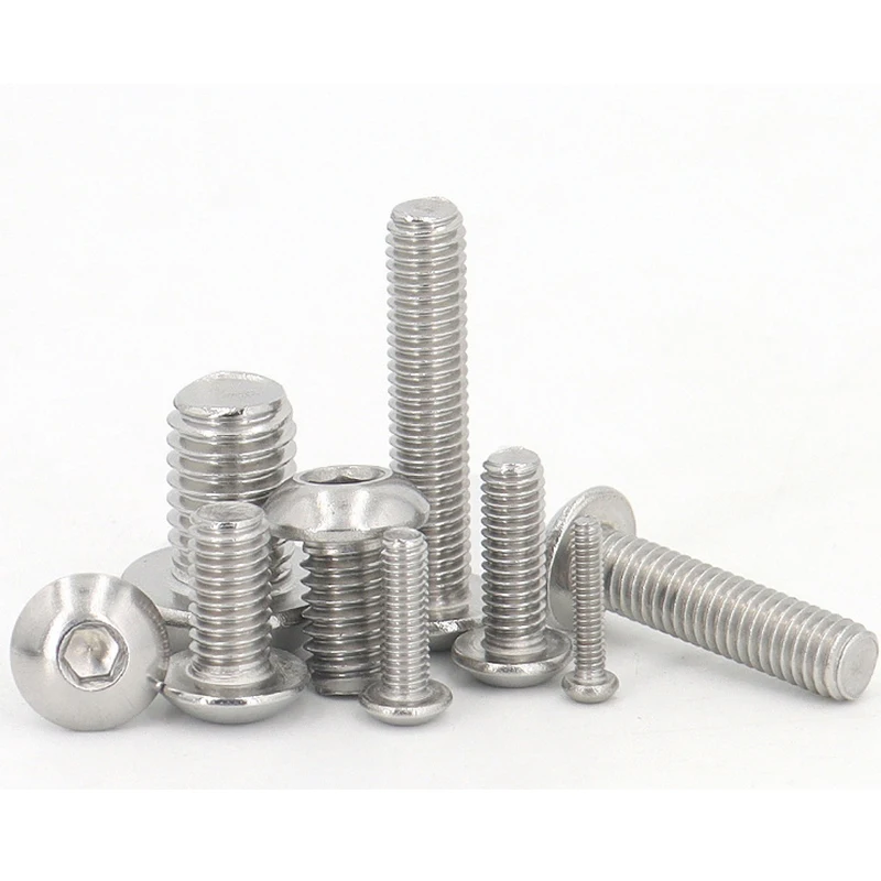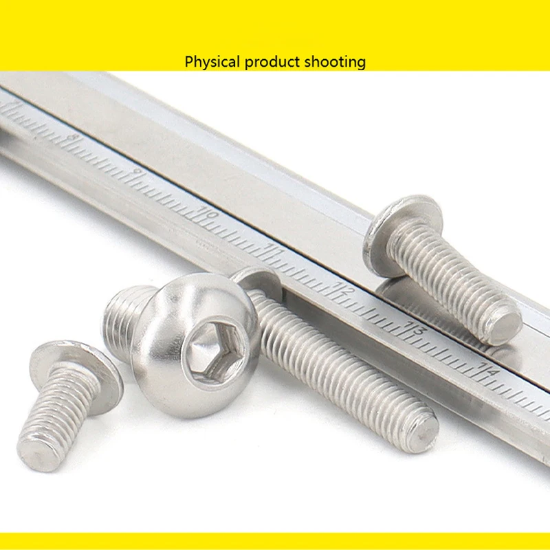 This collection includes 20 pieces of stainless steel big flat round head inner hexagon screw bolts designed for metalworking applications. The screws feature a polished, shiny finish and come in sizes M5 (M5x10, M5x12, M5x16, M5x18, M5x20, M5x25, M5x30, M5x35) and M6 (M6x10, M6x12, M6x14, M6x16, M6x18, M6x20, M6x25, M6x30, M6x35). Each screw has a pan head style and is equipped with an inner hexagon socket drive for enhanced installation precision. The well-defined threading along the shafts ensures secure fastening for various tasks.