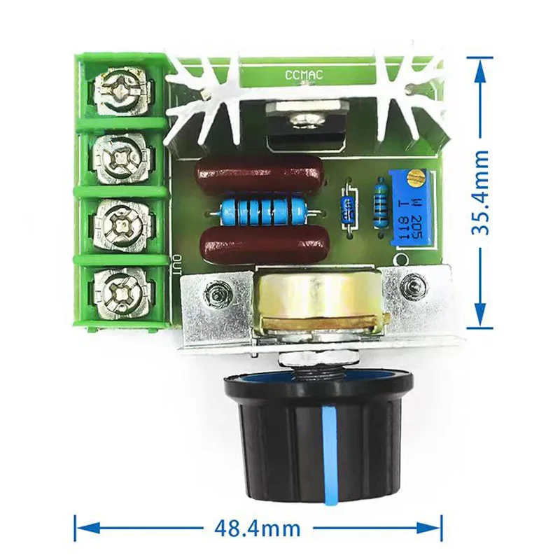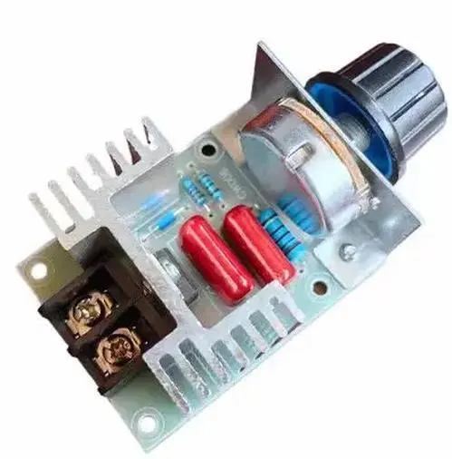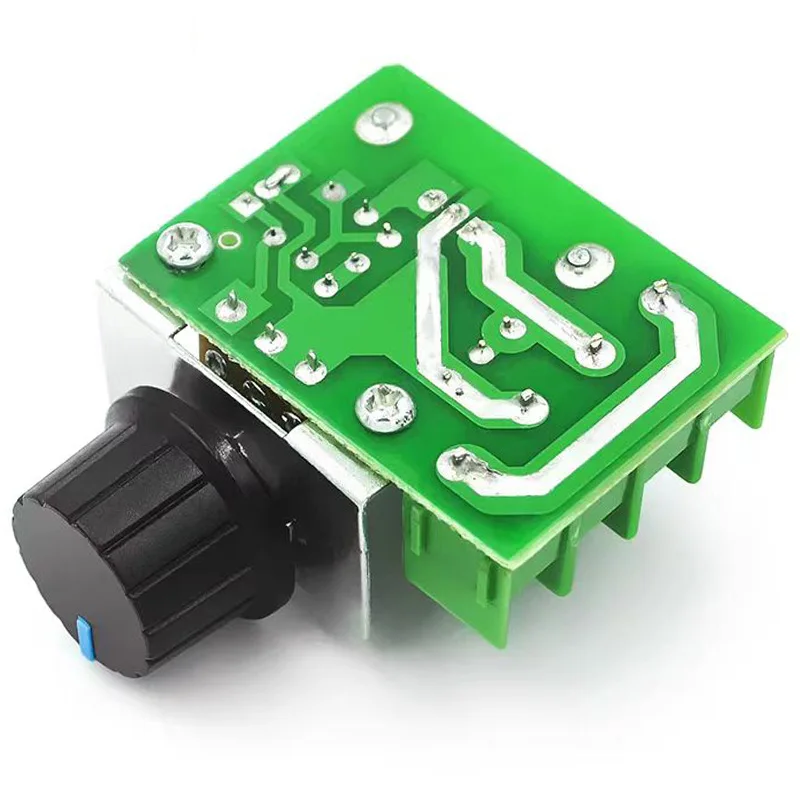 Imagine effortlessly adjusting your high-power appliances with this this 2000W silicon-controlled electronic regulator. Its sleek, industrial design combines a matte black rotary knob with a vibrant blue indicator line for intuitive control. The green circuit board with visible components, complemented by gold connectors and a sturdy black heatsink, showcases craftsmanship and durability. Whether you’re managing heating, lighting, or motor speed, this device offers precise voltage, temperature, or speed regulation within a broad range of AC 50-220V—all in a compact form. Its high-quality components ensure longer life, making it a reliable choice for both domestic and professional settings. Confidently take control of your appliances and enjoy improved efficiency and safety today.