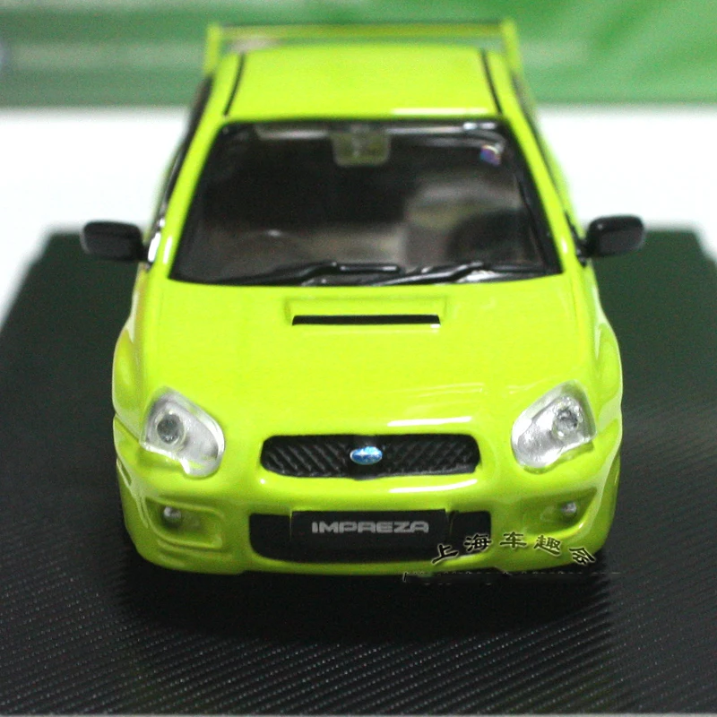 The 1:64 scale model car features the 2003 Subaru Impreza WRX STI Blobeye design, beautifully crafted from alloy and plastic. With a length of approximately 7 cm, it showcases a bright lime green option with black accents and a vibrant red version, both designed with detailed headlights, distinctive grilles, and pronounced hood scoops. Its diecast construction ensures durability, and the well-crafted wheels provide functionality for rolling. Each model is positioned on a sleek black display base, complete with a silver label reading “Impreza,” making it a perfect collectible for automotive enthusiasts.