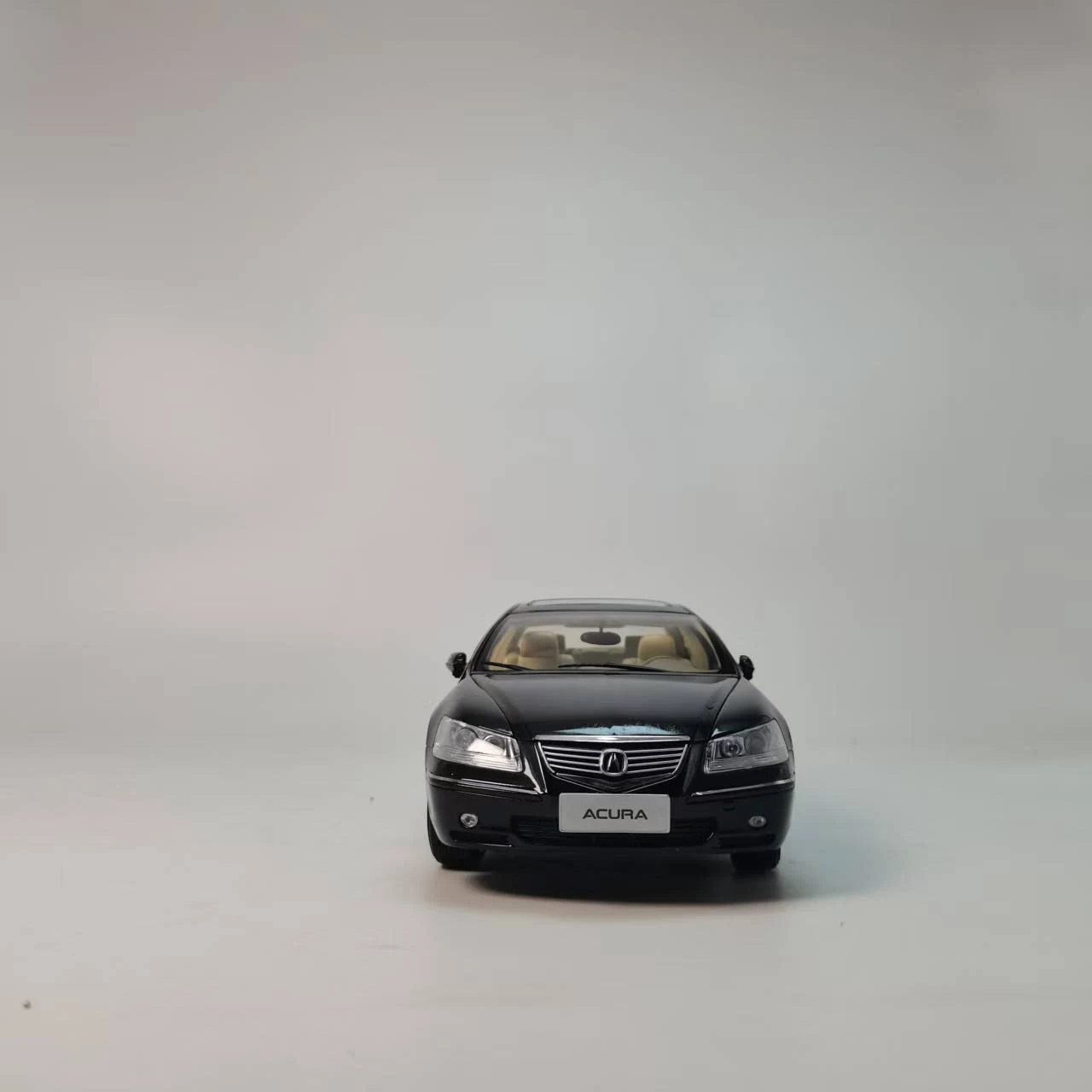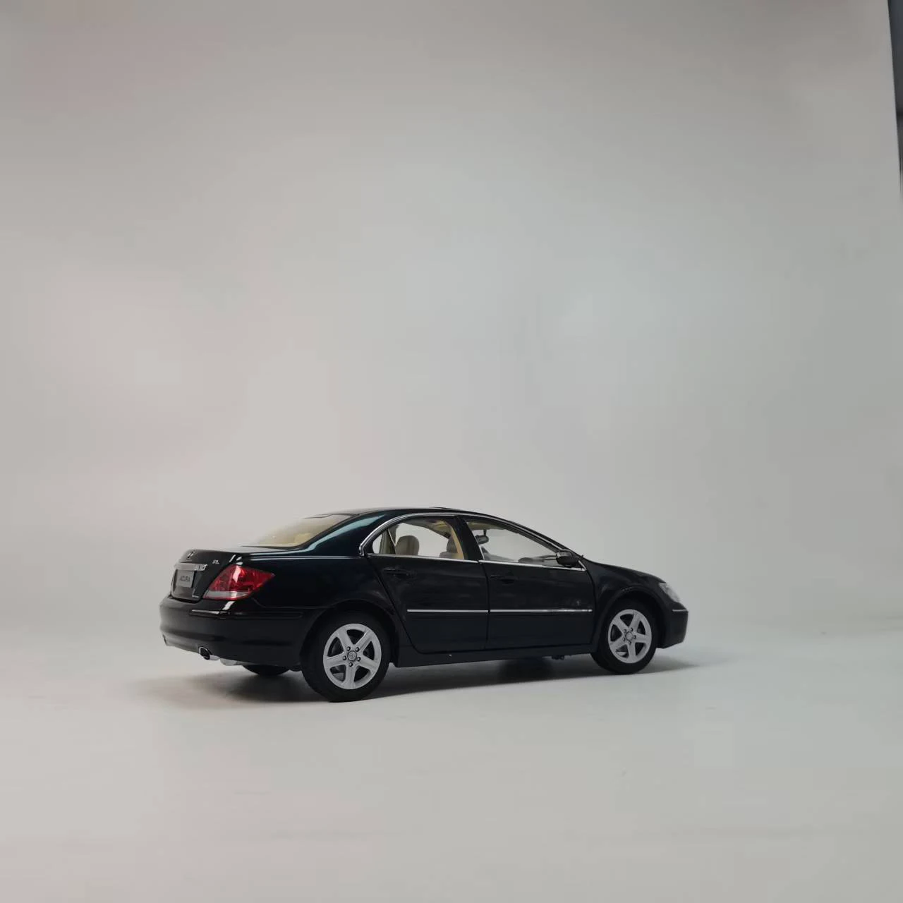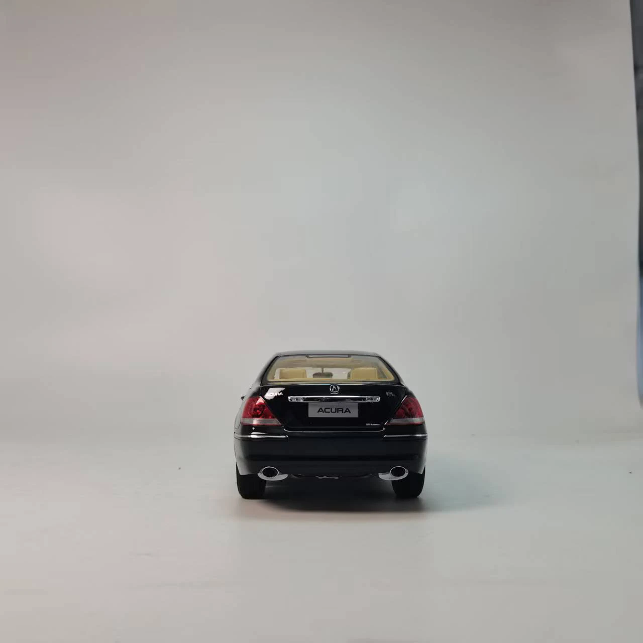 This 1:18 scale diecast model of the 2006 Acura RL features an alloy body with plastic and rubber details, including functional doors that open, offering a realistic and detailed representation. The sleek black exterior with a glossy finish highlights its aerodynamic sedan design, with sharp headlights, a refined grille, and realistic side mirrors and door handles. Transparent windows reveal a beige interior, while silver detailed rims and rubber tires add authenticity. Despite minor paint imperfections due to storage, this static collectible is ideal for display, gifting, and appreciation by adult collectors. It comes in a color box and is recommended for those aged 14 and above.