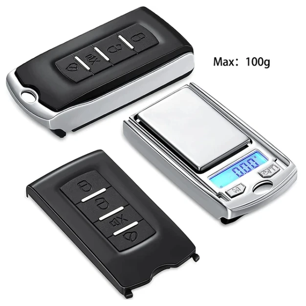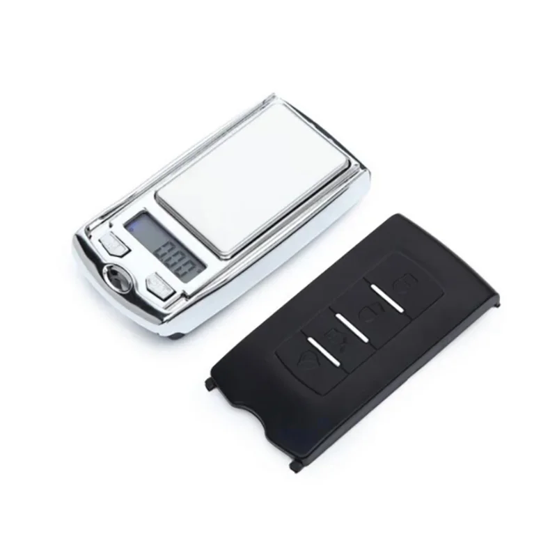This portable digital pocket scale is uniquely designed to resemble a car key, merging style with functionality. It boasts a shiny silver, stainless-steel-like weighing surface that is not only sleek but also ensures durability and easy cleanings. With a maximum capacity of 200g or 100g and a precision of 0.01g, it offers reliable measurements for various needs. The bright blue backlit LCD display facilitates easy reading, making it perfect for your on-the-go lifestyle. The removable black cover adds to its portability, featuring distinct buttons to control the scale's functions. Just remember, this scale requires separate batteries for operation to function flawlessly.