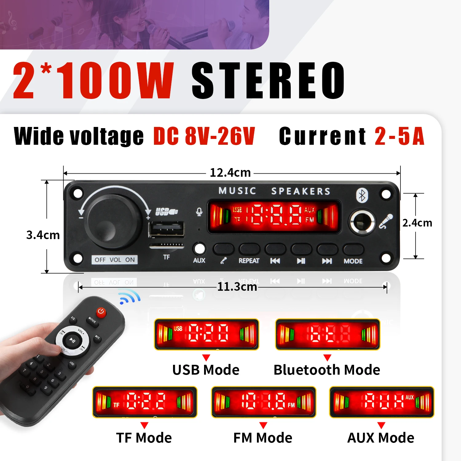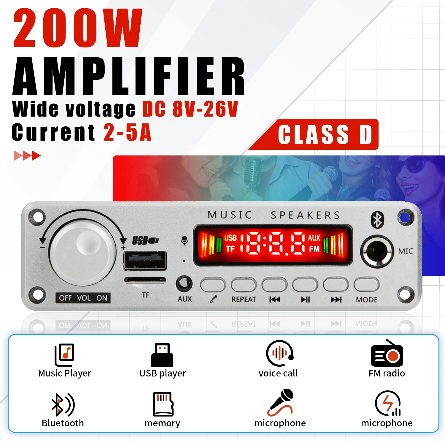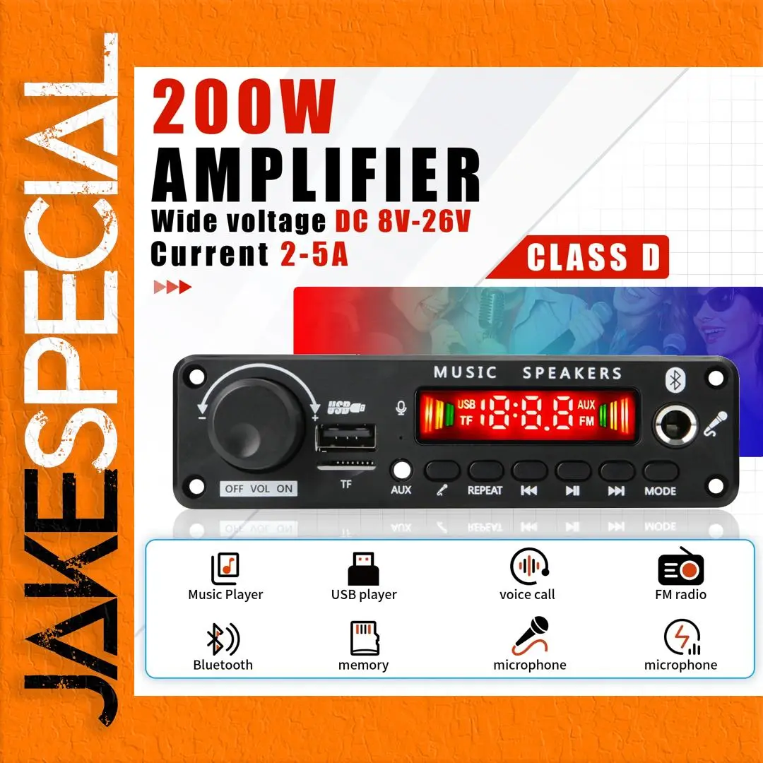 The 200W DIY Home Digital Amplifier delivers impressive audio power with a dual output of 2 x 100W, operating on a DC voltage range of 8V-26V. It supports a variety of audio formats including MP3, WAV, FLAC, and APE, and is equipped with a DAC and DSP both set at 5336. Featuring Bluetooth version 5.0, FM radio support (87.5-107.5 MHz), and voice recording capabilities, this amplifier is incredibly versatile. With a signal-to-noise ratio of ≥89dB and an external memory option, it also ensures a battery life of over 20 hours. The unit includes USB, TF, and LINE IN inputs, plus an intuitive control interface with volume, EQ, and playback options.