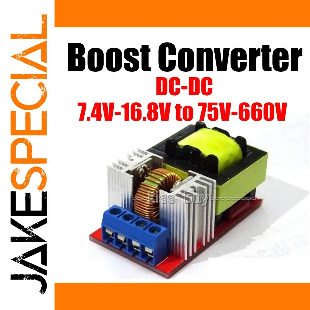 - This module converts a 7.4V-16.8V DC input into a high-voltage output of 75V-660V, supporting precise power boosts suitable for capacitor charging and high-voltage experiments.