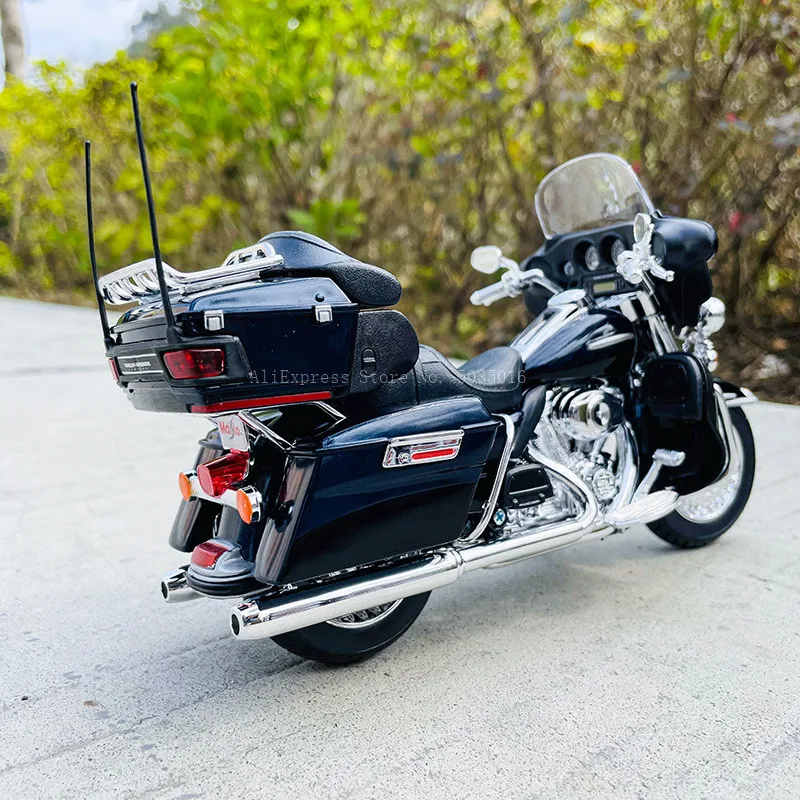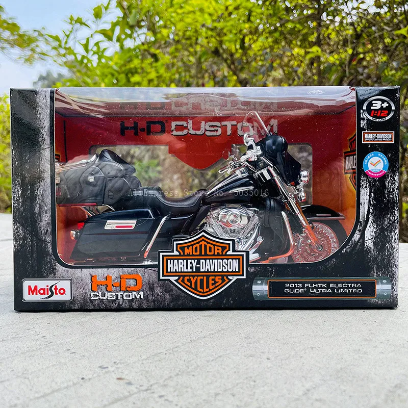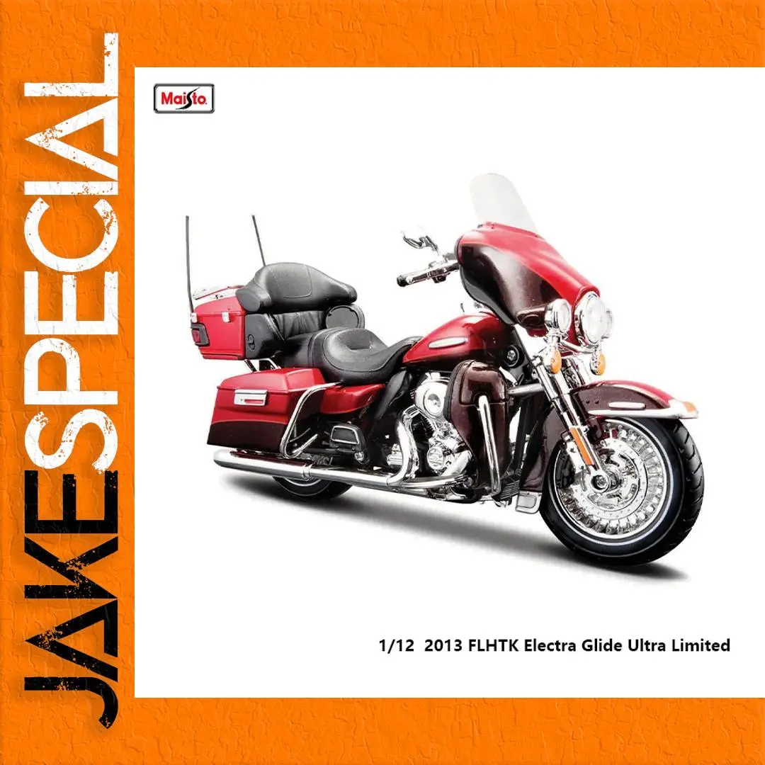 Bring home this highly detailed 1:12 scale die-cast Harley-Davidson FLHTK Electra Glide Ultra Limited motorcycle model by Maisto, crafted from durable metal. Featuring a sleek deep red finish accented with black details on the seat, handlebars, and front fairing, it offers intricate bodywork, including realistic fuel tanks, luggage compartments, and a streamlined front fairing with a clear windshield. Chrome accents highlight features like the headlamp, exhaust pipes, and engine components, while detailed spoke wheels with treaded black tires add to its authentic look. Suitable for collectors aged 4 and above, this model is a perfect display of craftsmanship and realism.