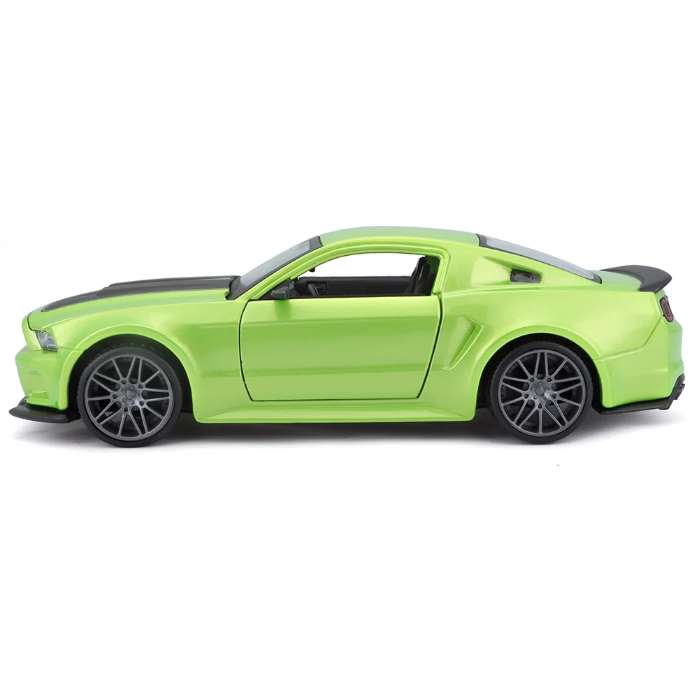 This highly-detailed 1:24 scale model of the 2014 Ford Mustang Street Racer captures the essence of this iconic vehicle. Finished in a vibrant lime green with a glossy sheen, it features an aggressive design, highlighted by its black grille and racing stripe. The functional doors reveal a meticulously crafted black interior, demonstrating the exceptional quality of Maisto craftsmanship. The model emphasizes realism with features such as a detailed engine insert and multi-spoke alloy-style wheels. Whether as a gift or for personal collection, this die-cast model appeals to any auto enthusiast.