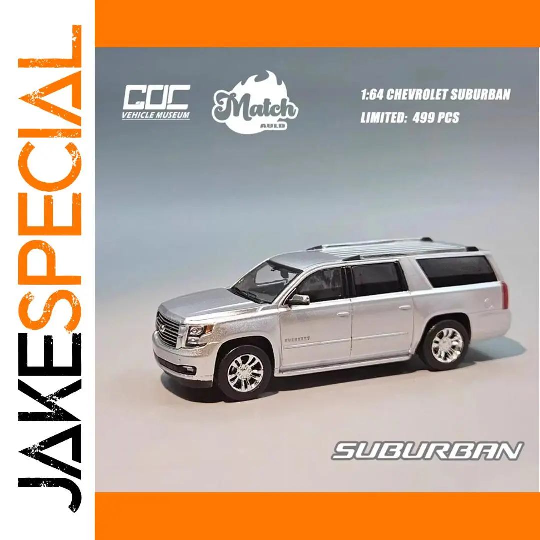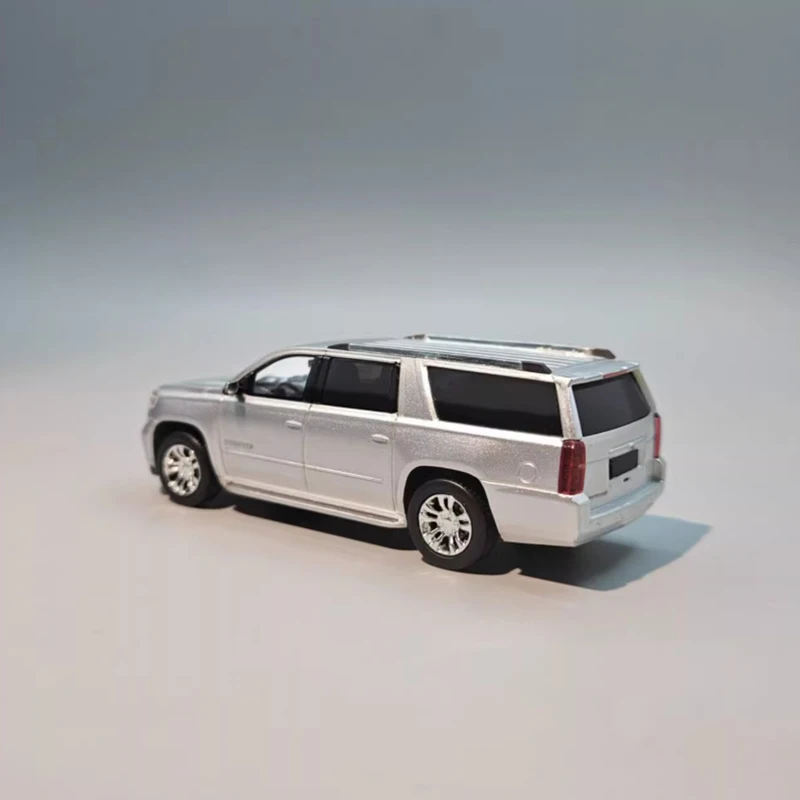 Experience the realism and craftsmanship of this stunning 1:64 scale diecast model of a 2015 GMC Suburban. Perfect for collectors and enthusiasts, this model captures the essence of the full-sized vehicle with incredible detail and accuracy. The sleek metallic silver finish or your choice of black, blue, gray, white, CHE, or CHE Kodiak colors adds a contemporary touch to your display. Crafted from sturdy metal, it features precisely molded components, including a prominent grille with horizontal slats, clear plastic headlights, and dark-tinted windows, offering a striking contrast. The subtle roof ridge details and multi-spoke rims with rubber-like tires further enhance its realistic appeal. Whether displayed on your shelf or as part of a collection, this model combines aesthetics and craftsmanship for a truly impressive showcase.