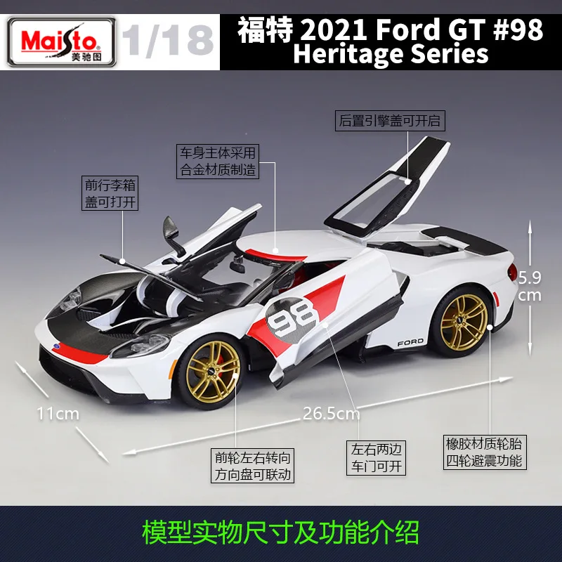 - Technical specifications include a 1:18 scale, metal construction, and coloring designed for visual impact, with detailed front headlamps, grille, and aerodynamic rear features.