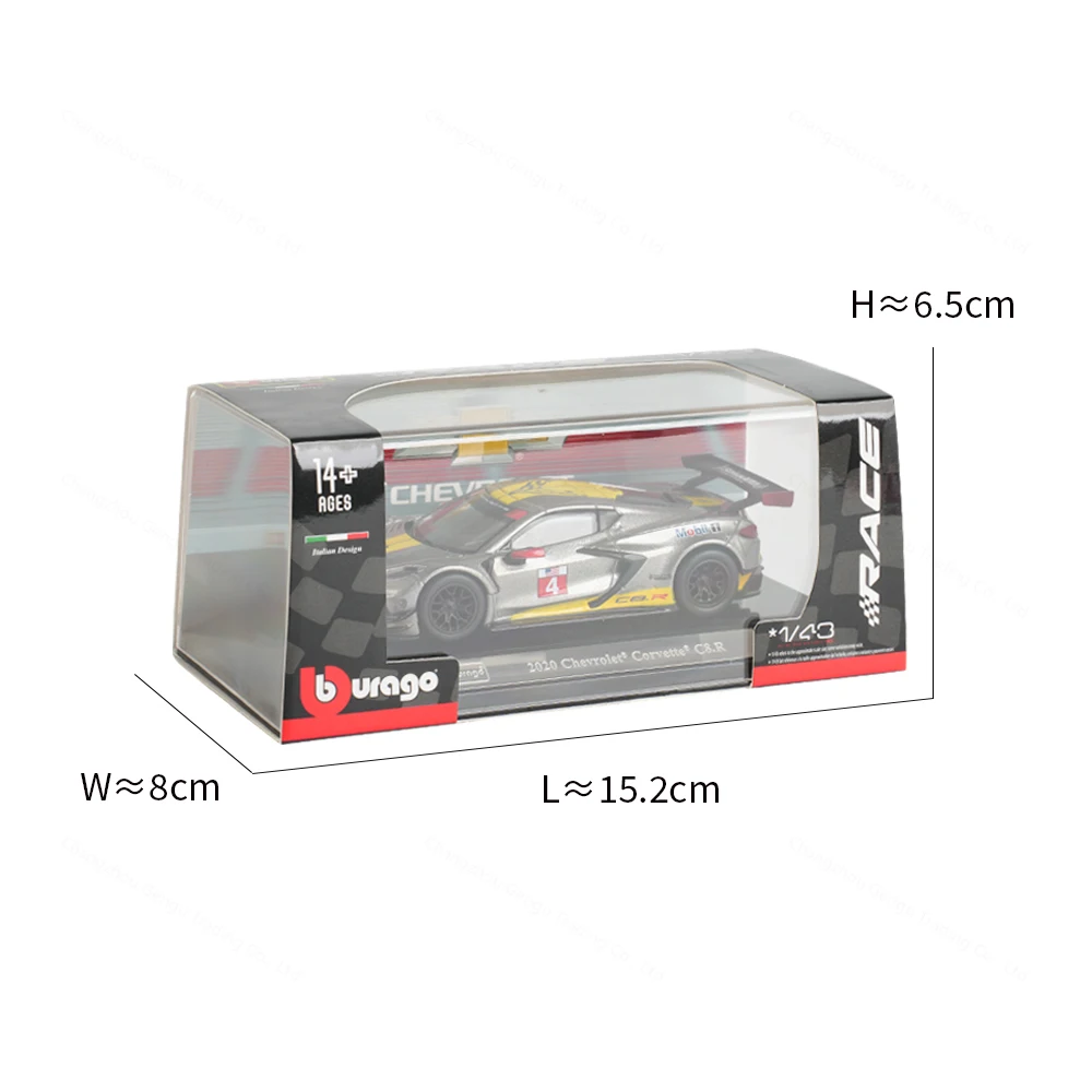 Experience the thrill of racing with this meticulously crafted Bburago 1:43 scale model of the 2020 Chevrolet Corvette C8.R. Measuring approximately 11.1 centimeters long, 5.3 centimeters wide, and 3.1 centimeters high, this die-cast collectible captures every detail of the real racing car. The metallic silver finish offers a realistic glossy surface, complemented by vibrant yellow racing stripes running from the hood to the rear wing. Black graphics near the front, red-painted side mirrors, and a finely sculpted grille and headlights add to the authenticity. With detailed aerodynamic elements, treaded black wheels, and four-wheel free rotation, this model is perfect for display or collection. It’s an ideal addition for motorsport enthusiasts or collectors.