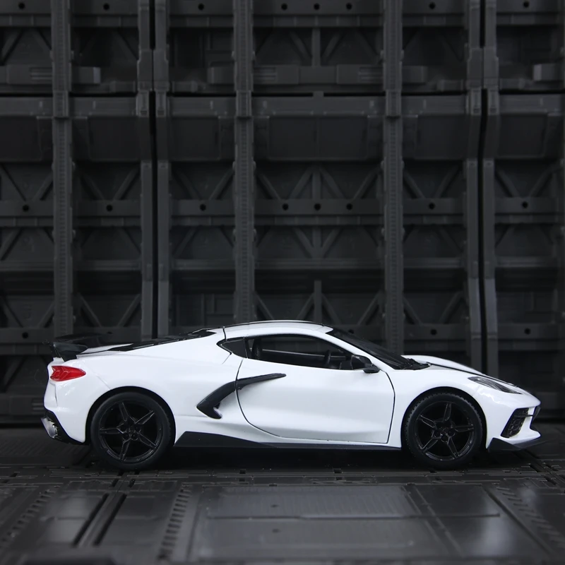- Accurate detailing includes sharp, angular headlights, a black grille with a Corvette emblem featuring crossed flags, and realistic alloy wheels with detailed rims and tires.