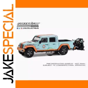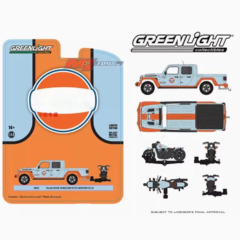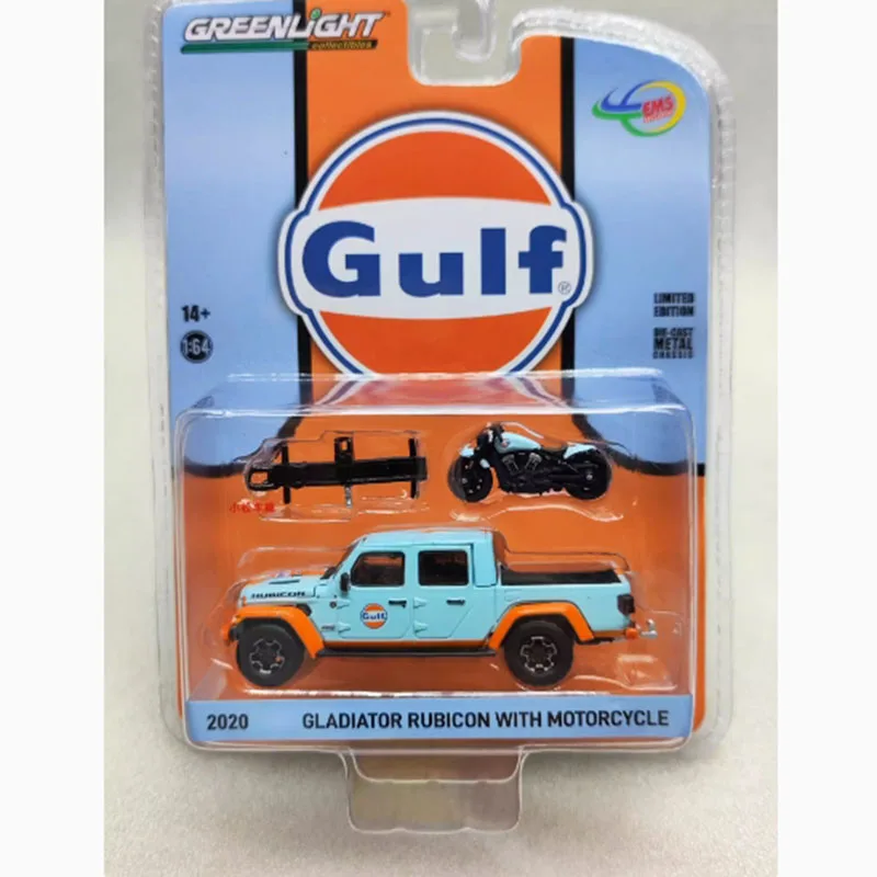 This 1:64 scale diecast model captures the rugged style of a 2020 Gladiator Rubicon pickup truck paired with a motorcycle, crafted from alloy and plastic. The vehicle features a vibrant light blue exterior accented with bold orange highlights along the wheel arches, side skirts, and hood, complemented by black-tinted windows, a detailed front grille, and realistic headlights. The black wheels with silver accents mimic off-road tires, emphasizing its adventurous aesthetic. Designed for collectors aged 14 and above, this static display model offers exceptional detail and durability, making it perfect for display, gifting, or collection purposes, bringing a dynamic, vintage racing-inspired vibe to any collection.