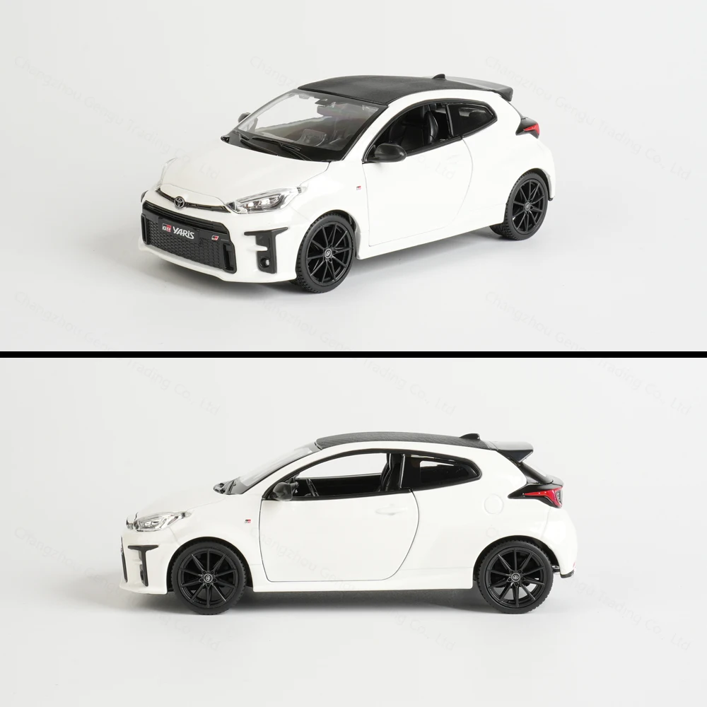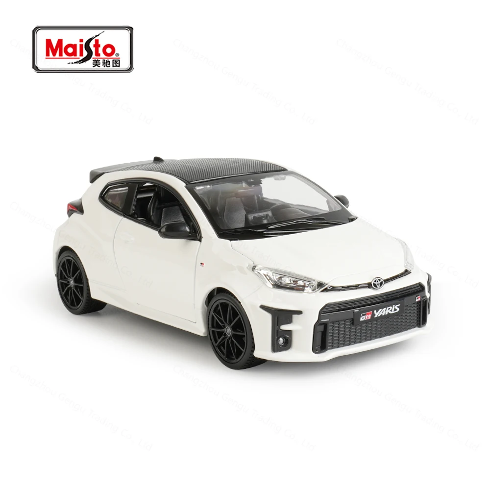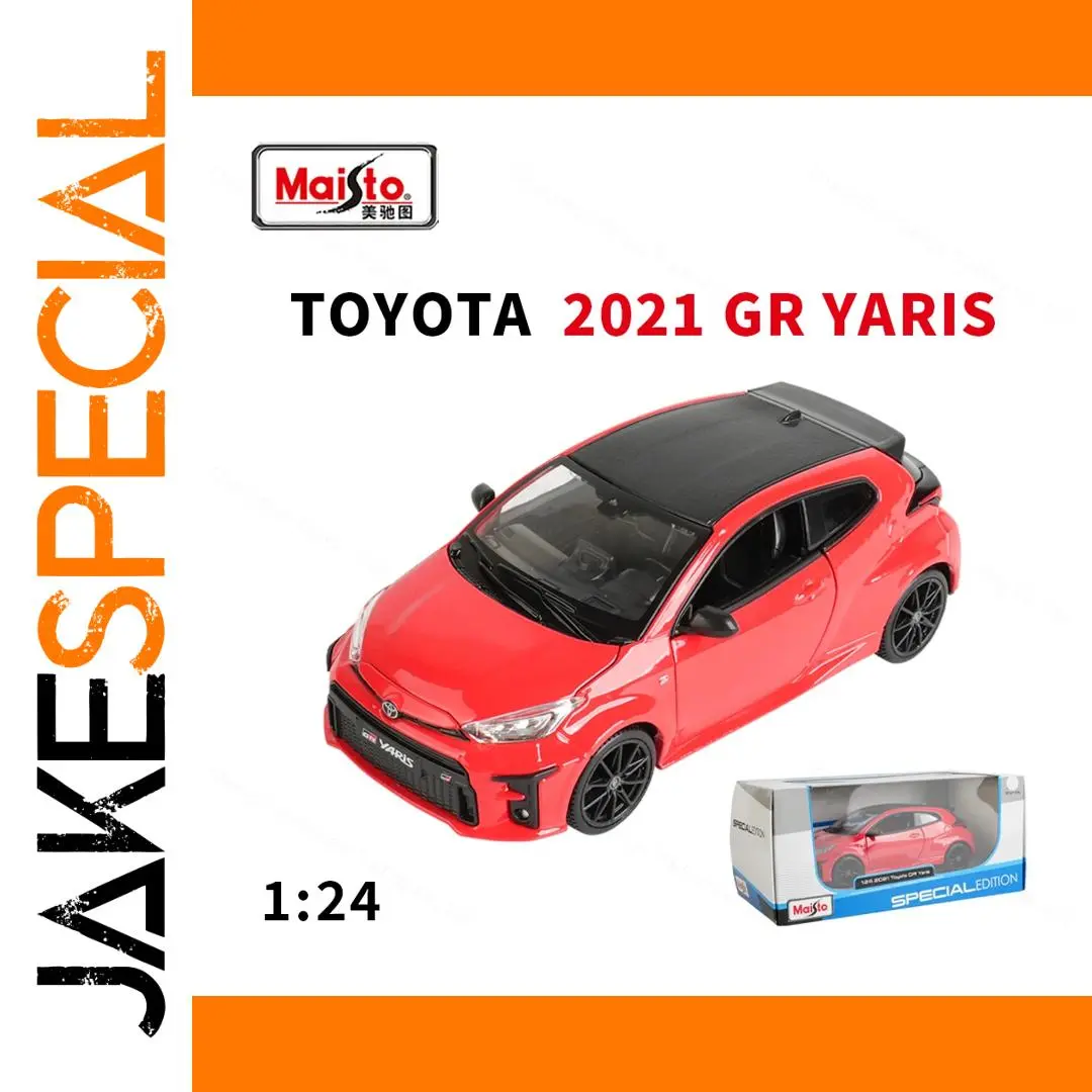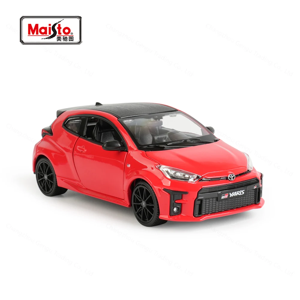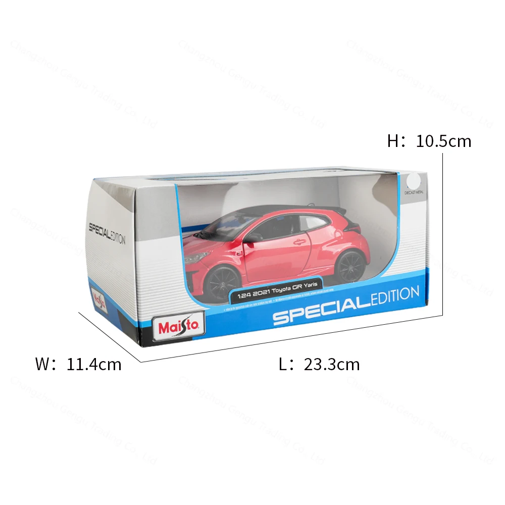 This highly detailed Maisto 1:24 scale die-cast model car captures the sporty essence of the 2021 Toyota GR Yaris with exceptional realism. Measuring approximately 16.7cm in length, 8.6cm in width, and 6.2cm in height, this model features a vibrant red body with contrasting black accents, including a black roof, side mirrors, and multi-spoke wheels with low-profile tires. The aerodynamic design showcases a sleek hood, detailed headlights, a prominent front grille, and a sporty rear spoiler, all complemented by functional openable doors and hood. Crafted from die-cast metal with plastic parts, it offers free-rotating wheels and is suitable for collectors aged 14 and above.