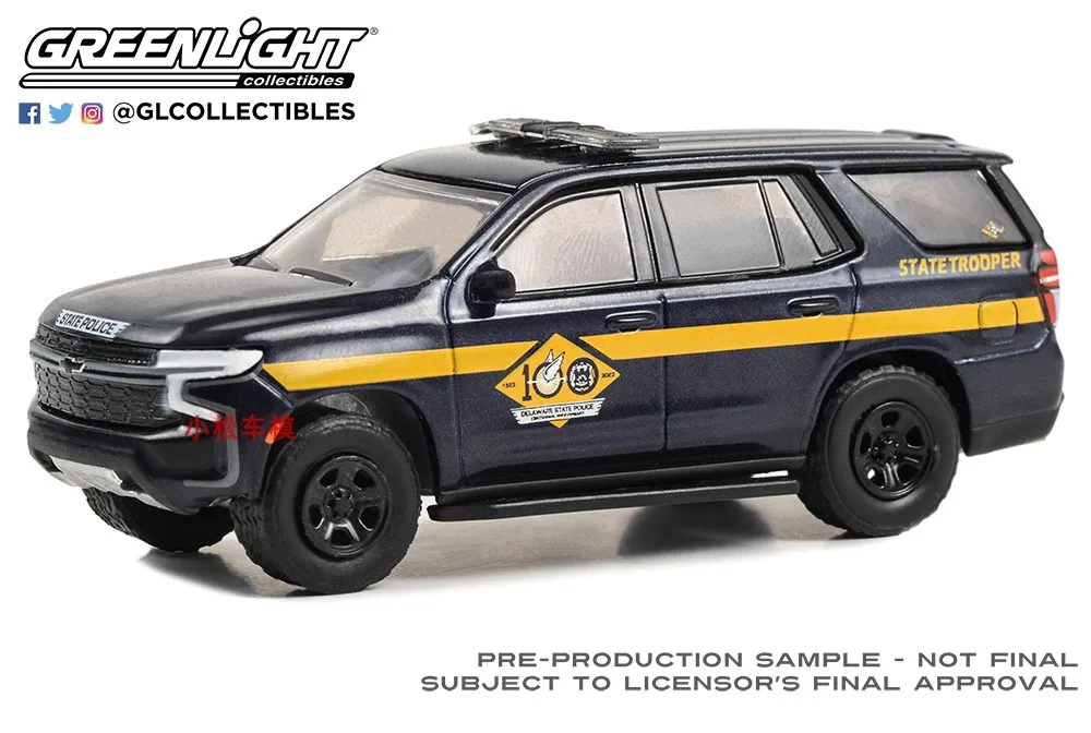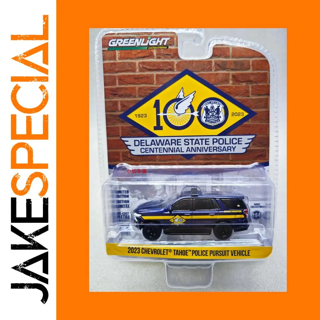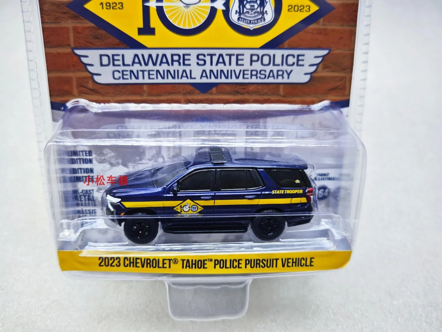Capture the essence of law enforcement with this highly detailed 1:64 scale diecast model of the 2023 Chevrolet Tahoe police pursuit vehicle, part of the Delaware Police commemorative series. Crafted from durable metal alloy, this static display features a sleek dark blue finish, accented by a bold yellow stripe along the side, and displays “STATE TROOPER” lettering along with a yellow diamond insignia and the number “100” celebrating the centennial milestone. Suitable for collectors aged 14 and above, it embodies realism with black wheels and intricate markings, making it a striking addition to any collection or display.