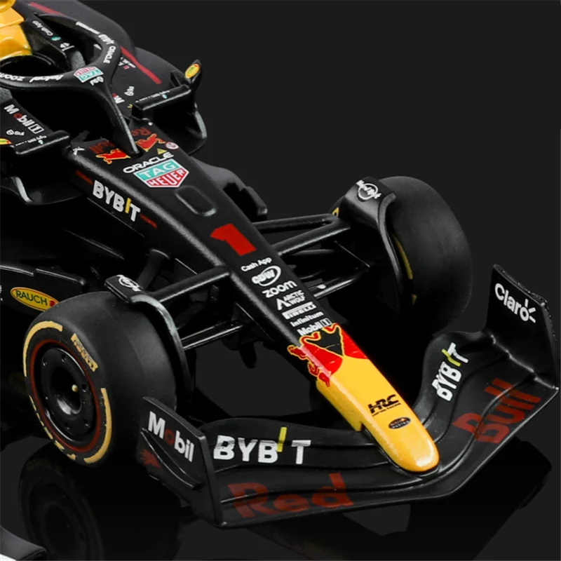 Imagine owning a highly detailed replica of the 2023 Red Bull RB19 Formula One car driven by Verstappen, capturing every sleek line and aerodynamic feature. Crafted from alloy and plastic, this 1:43 scale diecast model offers a realistic and eye-catching display piece. Its glossy black finish is accented with vibrant yellow and red decals, including the iconic Red Bull logo with a red bull and yellow horns on the engine cover. The model showcases intricate details such as sponsor decals, aerodynamic elements like winglets, fins, and bargeboards, and highly textured tires with yellow-ringed Pirelli branding. Perfect for passionate collectors and racing enthusiasts, it offers a dynamic visual that celebrates high-speed design and precision craftsmanship.
