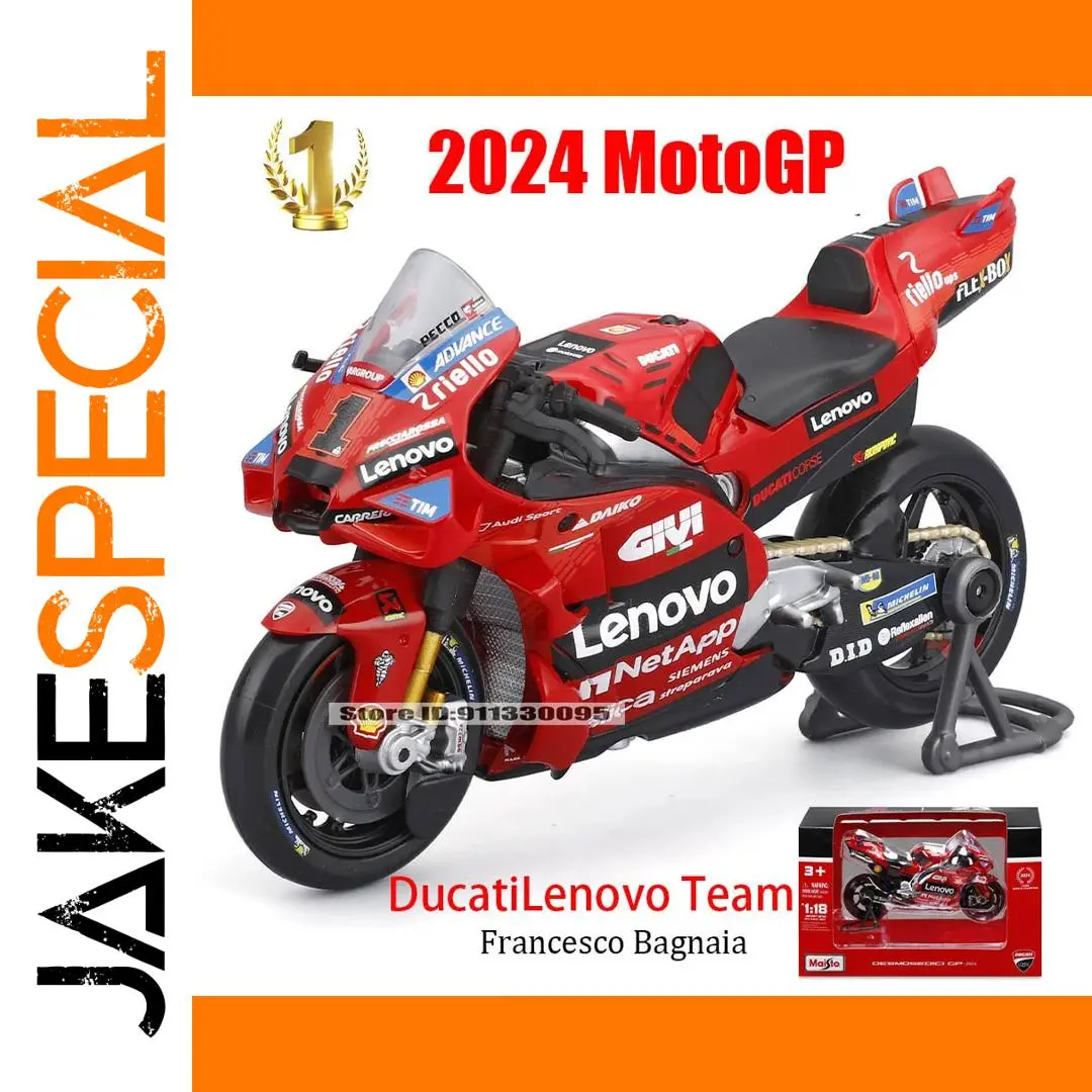 Experience the thrill of MotoGP with this highly detailed 2024 Ducati Lenovo Team #1 motorcycle model. Measuring approximately 12 cm in length, 4.5 cm in width, and 6.5 cm in height at a 1:18 scale, this replica captures the dynamic essence of professional racing. Its sleek, predominantly red body is adorned with sponsor decals like “Lenovo” and “Ducati Corse,” reflecting the real racing bike's bold style. The model’s fuel tank is crafted from die-cast metal for durability, while the meticulous plastic components showcase intricate fairings, wheels, and handlebars. Functional features, such as swinging wheels and handlebars, a movable kickstand, spring suspension, and free-rolling wheels, add realism and display value. Perfect for collectors or fans, it’s a superb piece to showcase or gift.