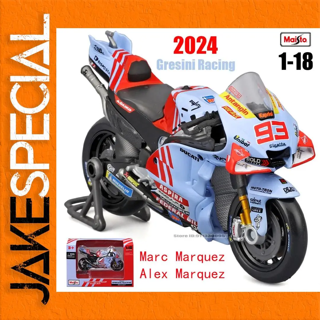 Imagine bringing the adrenaline of motor racing into your collection with this stunning 1:18 scale diecast motorcycle model of the 2024 Gresini Racing MotoGP team. Designed with meticulous attention to detail, it showcases the vibrant colors of racers Marc Marquez and Alex Marquez. The dynamic color palette of light blue, red, and black draws attention, while the intricate sponsor logos and graphic designs celebrate the spirit of MotoGP. This model not only displays beautifully on your shelf but also features functional components like a moveable kickstand and realistic wheels, enhancing its authenticity. Elevate your collection with this captivating piece!