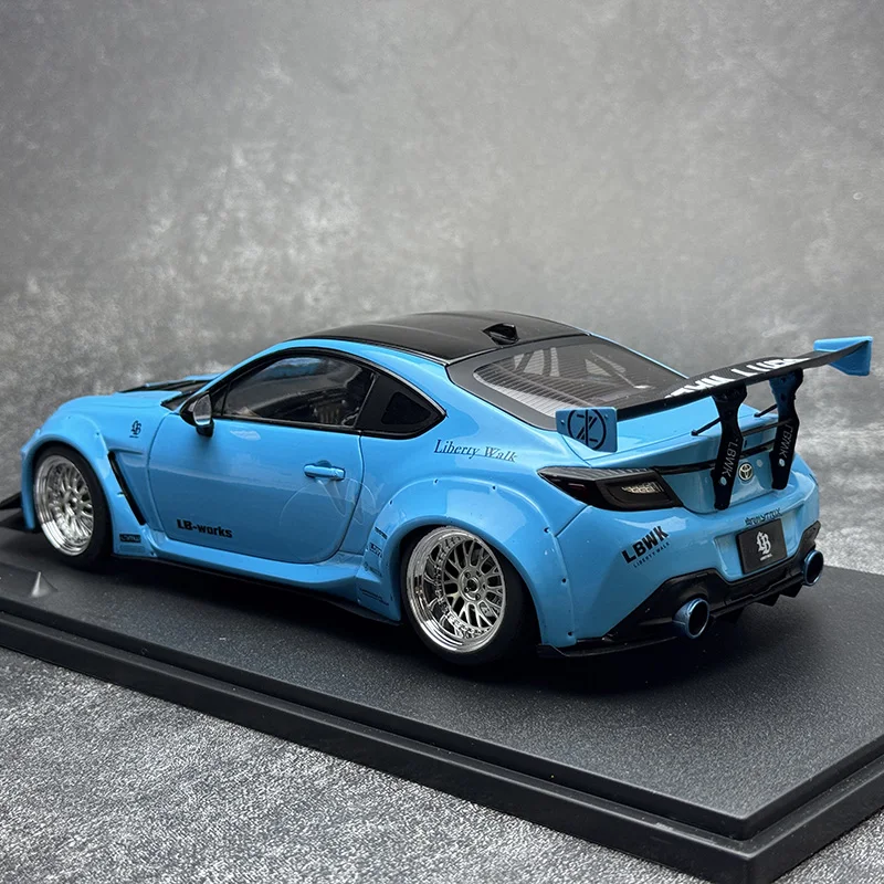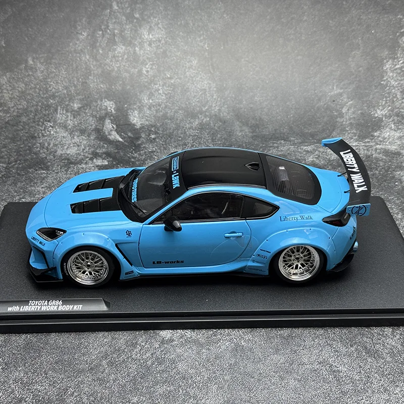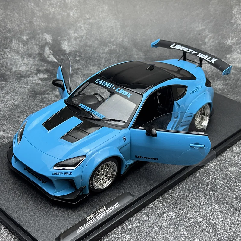 Experience the thrill of owning this beautifully crafted 1:18 scale diecast alloy model of the 2024 Toyota GR86. Perfectly detailed, this model captures the sporty essence with a vibrant blue finish and striking black accents. The sleek, aerodynamic design features angular headlights with clear lenses, a wide front bumper with air intakes and black splitter, and a prominent black rear wing spoiler. The flared wheel arches and multi-spoke silver rims wrapped in textured white-letter tires enhance its aggressive stance. The doors are functional, allowing you to open and showcase the detailed interior. Ideal for passionate collectors, it’s a showcase piece that transforms any display into a tribute to high-performance design and automotive craftsmanship.