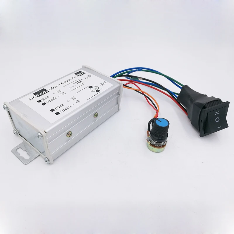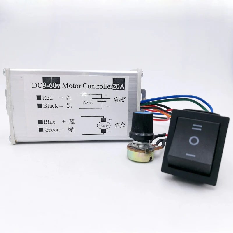 Experience precise control with this 20A DC motor speed controller, compatible with voltage ranges from 9V to 60V. Designed for brush motors, it features reversible PWM control for smooth acceleration and deceleration, along with a forward/reverse switch to easily change motor direction. The sturdy metallic silver housing, detailed wiring diagram, and organized multicolored wires ensure durability and compatibility with your existing DC motor setup. Whether used for automation projects, robotics, or hobbyist applications, this controller provides reliable and adjustable power management, making it an essential component for controlling motor speed and direction with ease and confidence.