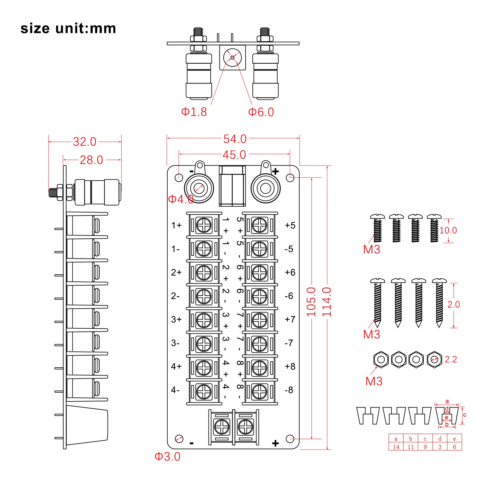 - Features eight pairs of output screw terminals suitable for wire gauges 12-22 AWG, capable of distributing a total current of 20A safely across multiple connections without overheating.